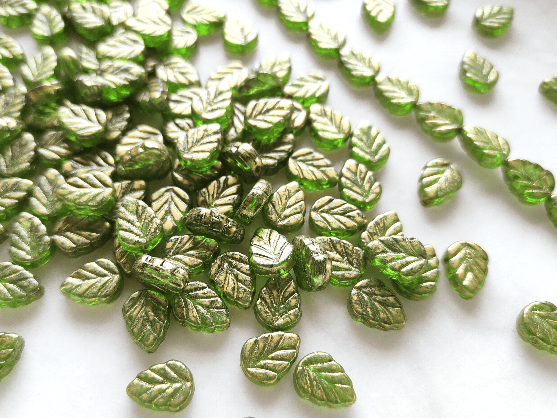 Kleine böhmische gepresste Blatt-Perlen in Form von einfachen Minzblättern mit feinen Druck-Details - diese Perlen wurden aus grünen Glas gefertigt mit goldener Beschichtung, 10mm groß
