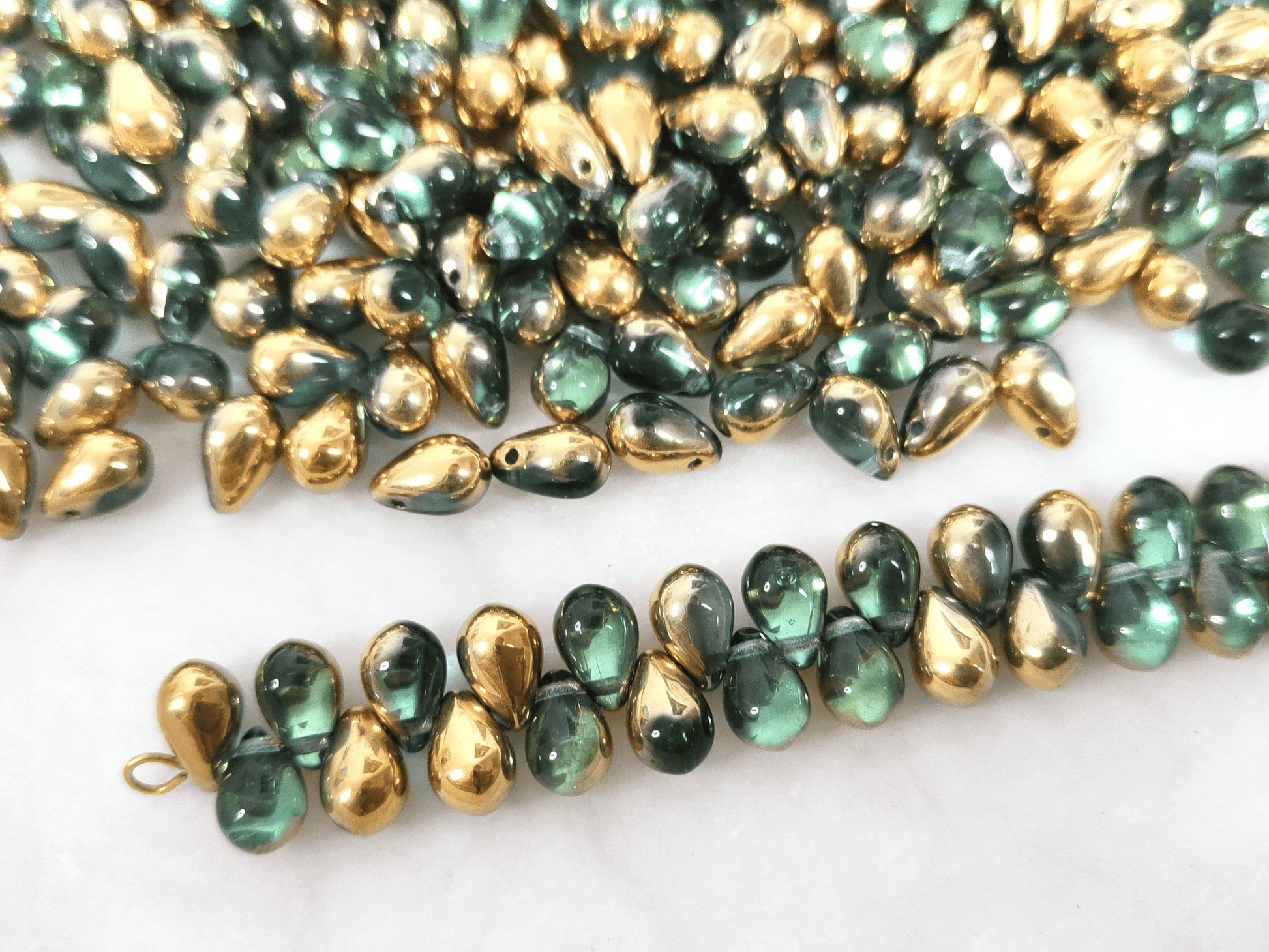Böhmische Tropfen-Perlen aus transparenten dnkelgrünen Glas mit halben metallischen Überzug in Gold, 6x9mm groß