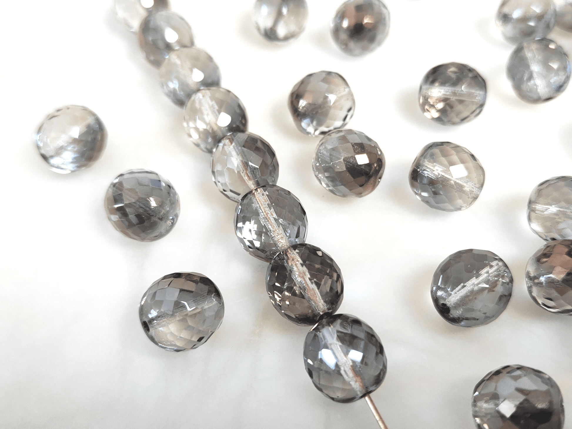 Large round Bohemian glass beads in size 12mm - fire-polished beads with sparkly facets made of transparent colorless glass with anthracite coloring and a bronze finish