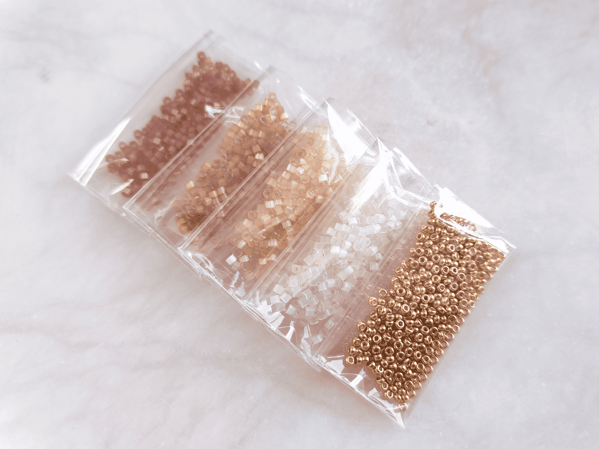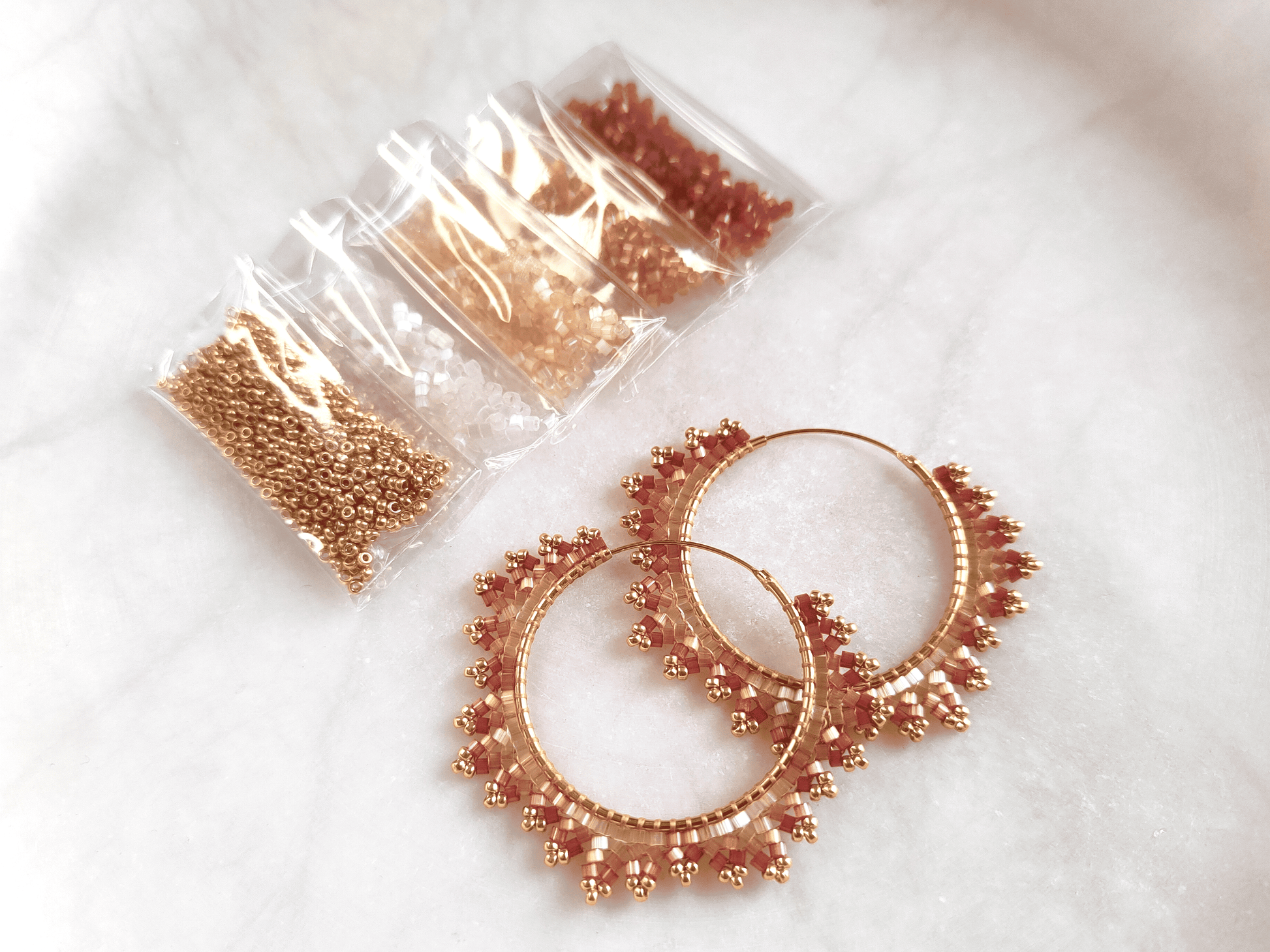 This bead kit contains Miyuki Delica 11/0 beads in four different satin colors, as well as Miyuki 15/0 seed beads. The color codes for the beads are also included. The kit contains a total of 6 grams of fine Miyuki brand beads—1 gram of Miyuki Delica beads in each color and 2 grams of Miyuki seed beads. The quantity of beads is sufficient to weave at least two pairs of "Estelle" hoop earrings.