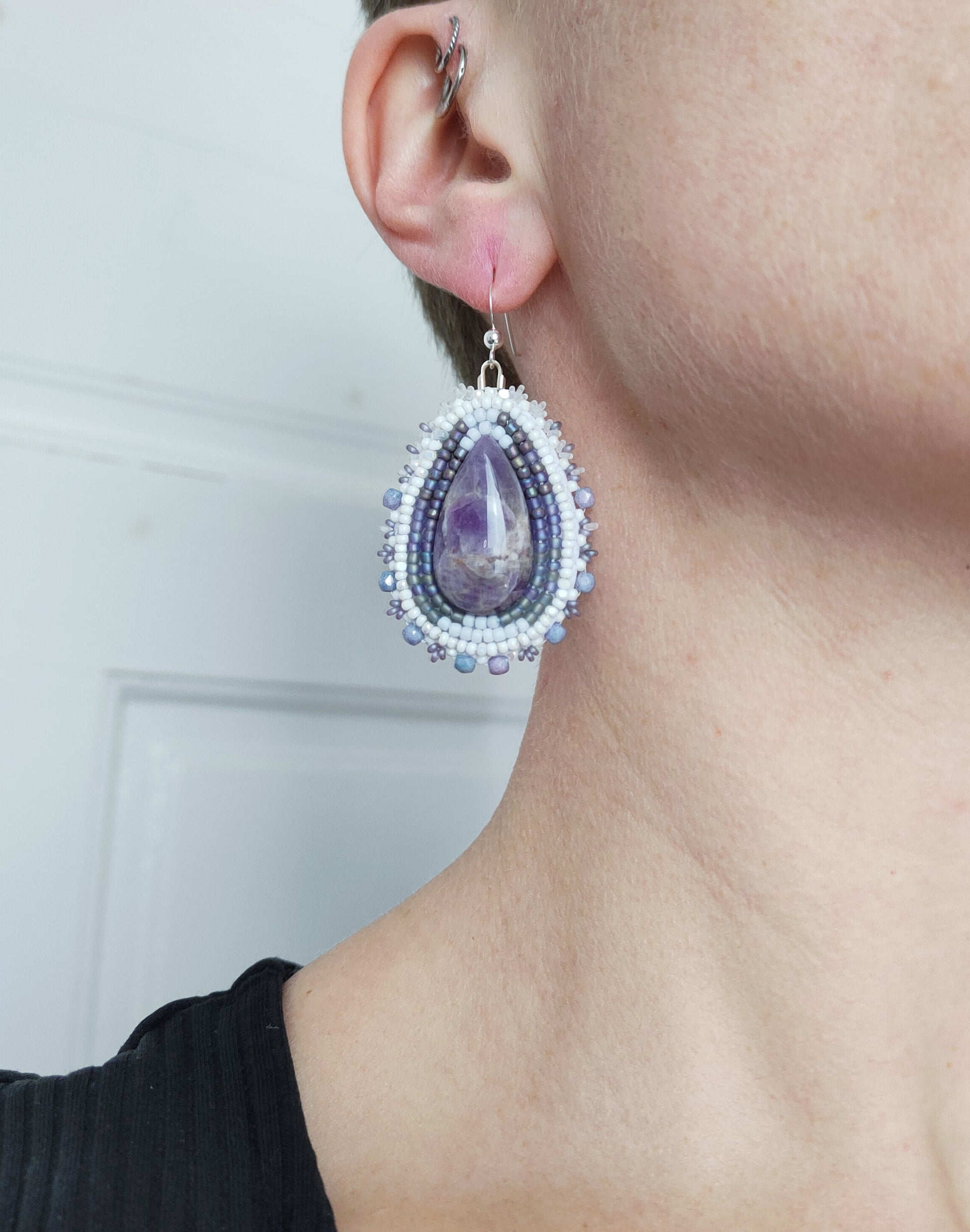 Embroidered earrings with polished amethyst cabochons decorated with fine seed beads in an ombre color gradient, edged with fire-polished glass beads