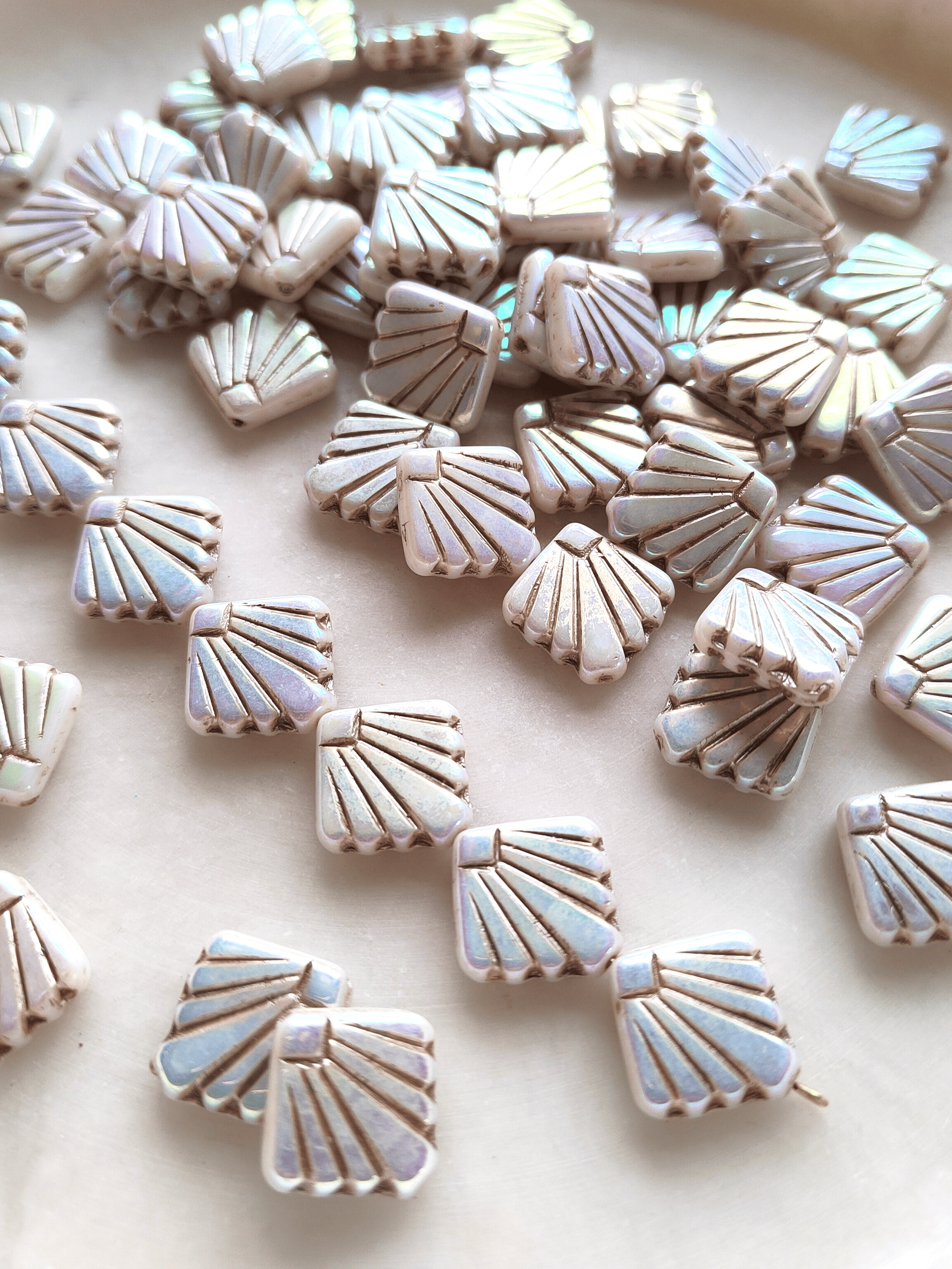 Bohemian pressed ornamental beads in the shape of a fan - made of white glass with a brown color wash and an iridescent finish, 17 x 17 mm in size