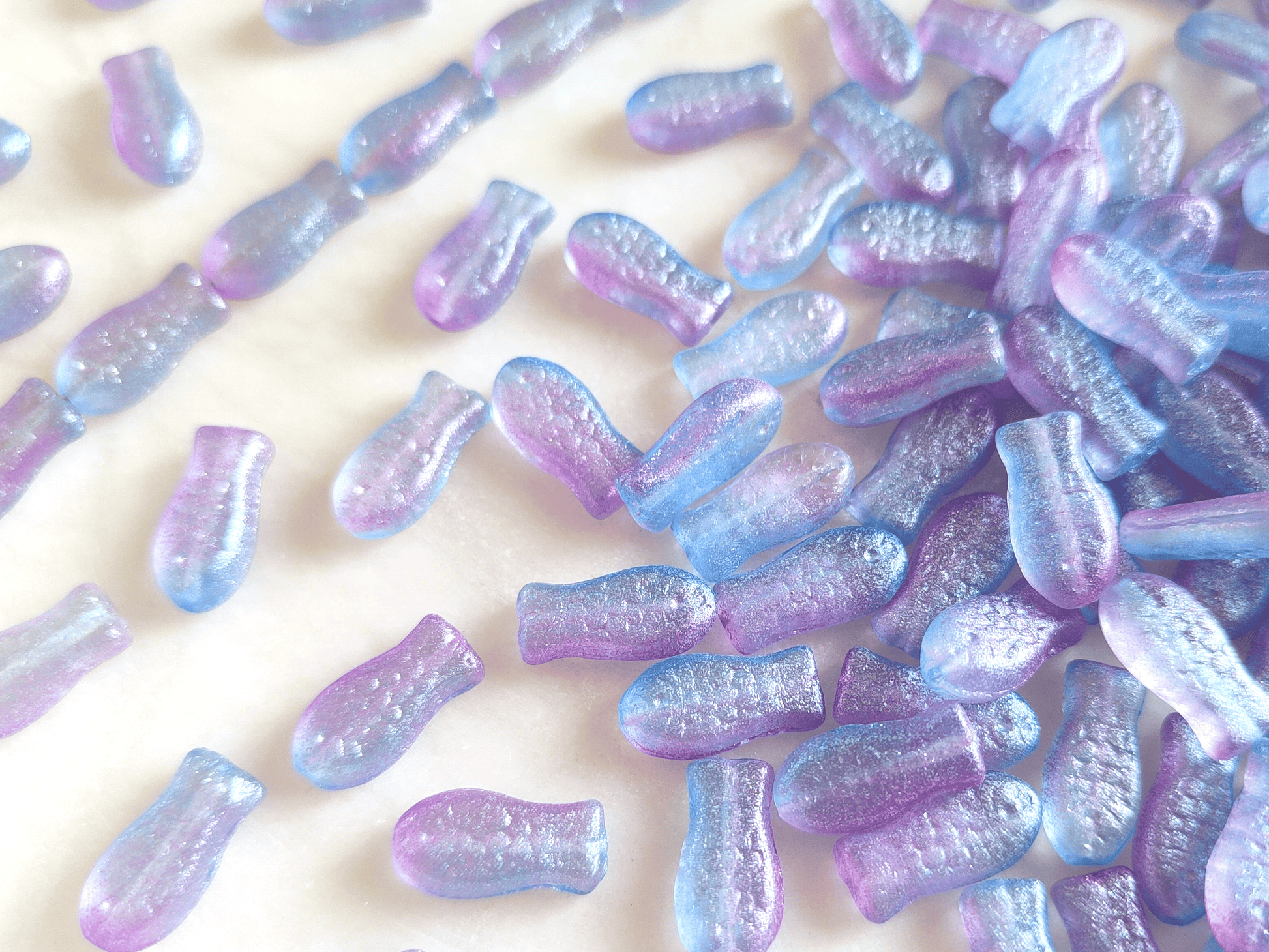 Bohemian animal glass beads in the shape of chubby fish with fine pressed details - these beads are made of colorless glass, sprayed with a purple and blue color mix and fine glitter particles, 24x10mm in size