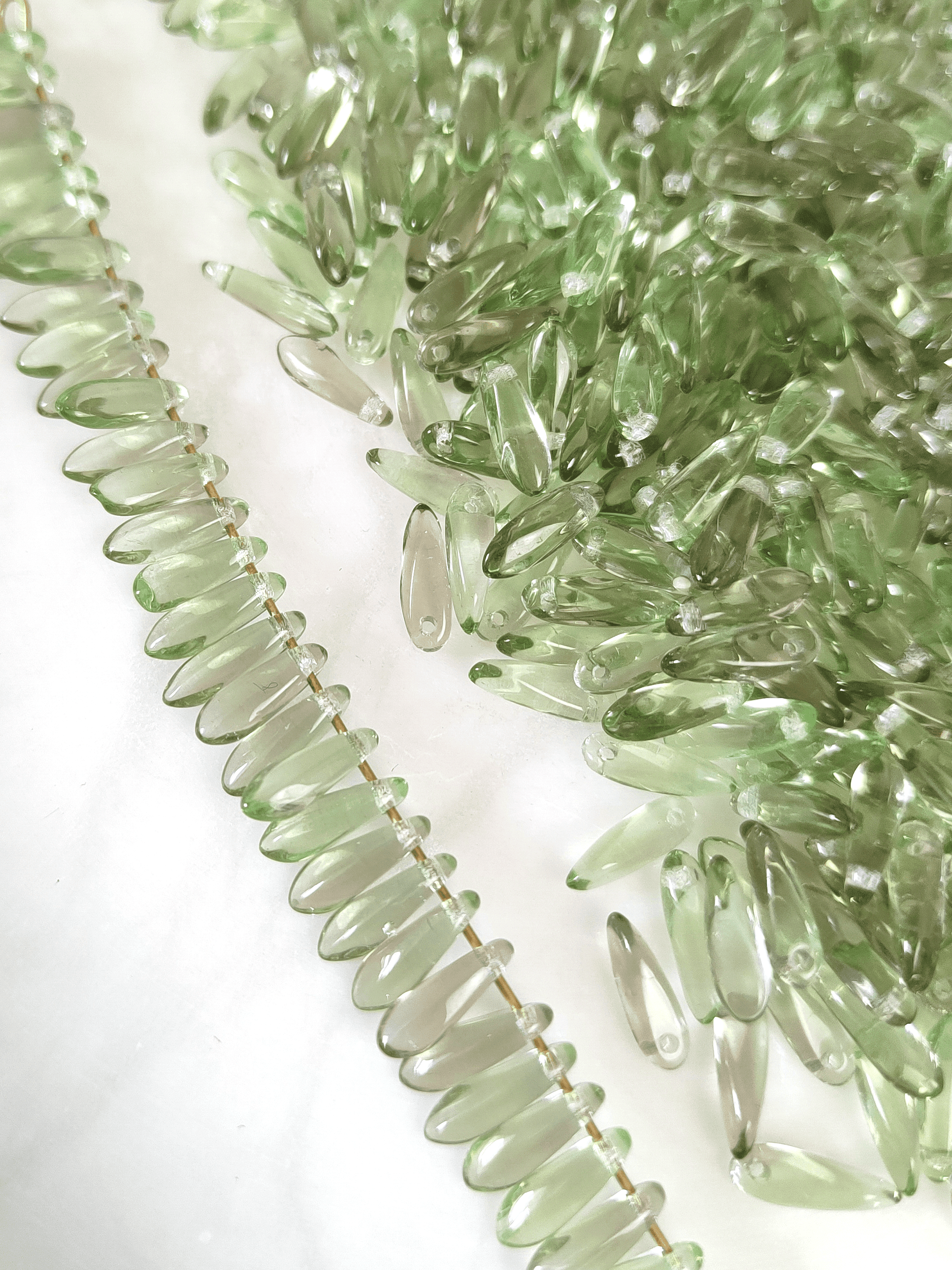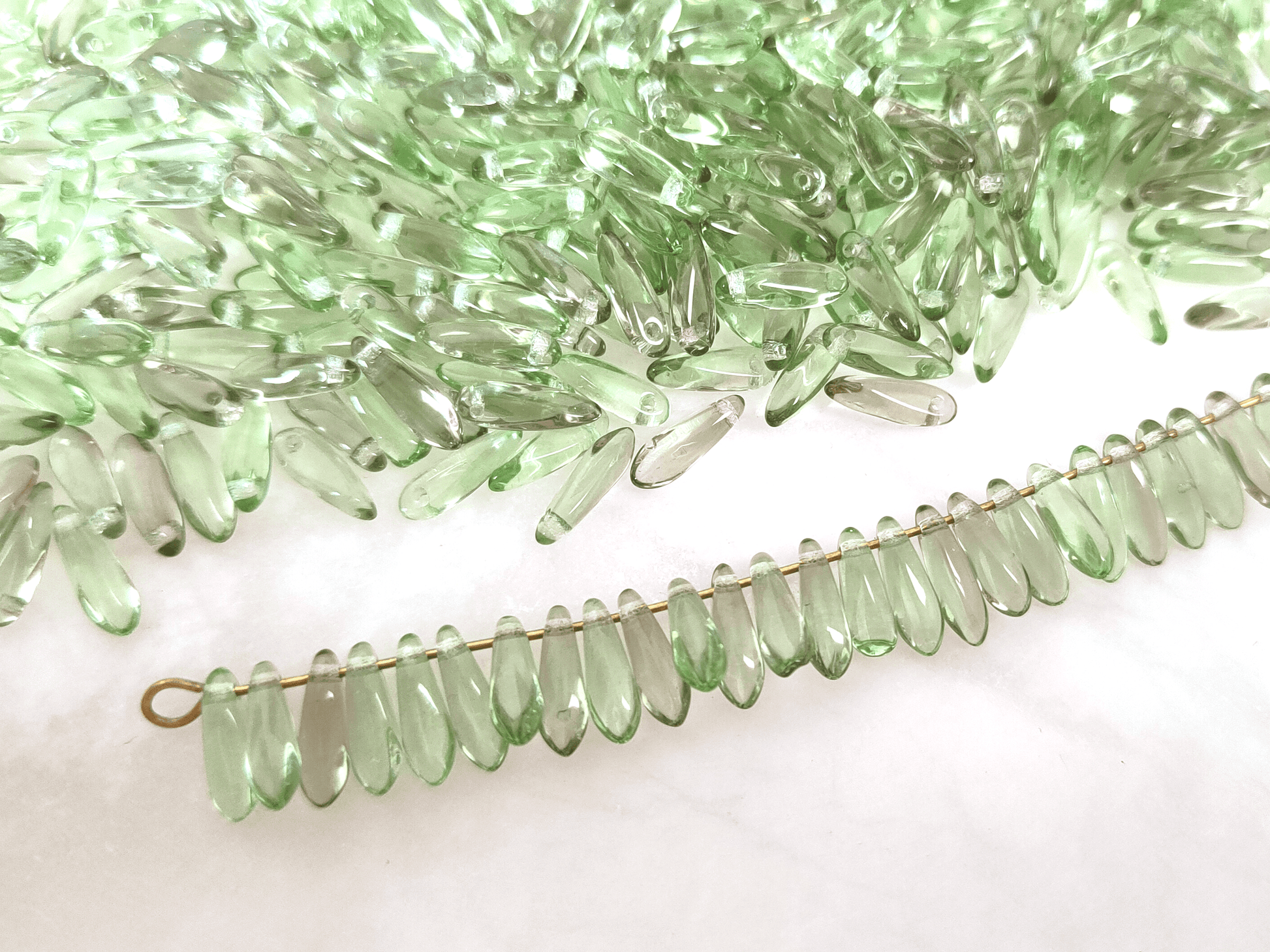 Small Bohemian dagger glass beads made of light green glass, 3x11mm in size