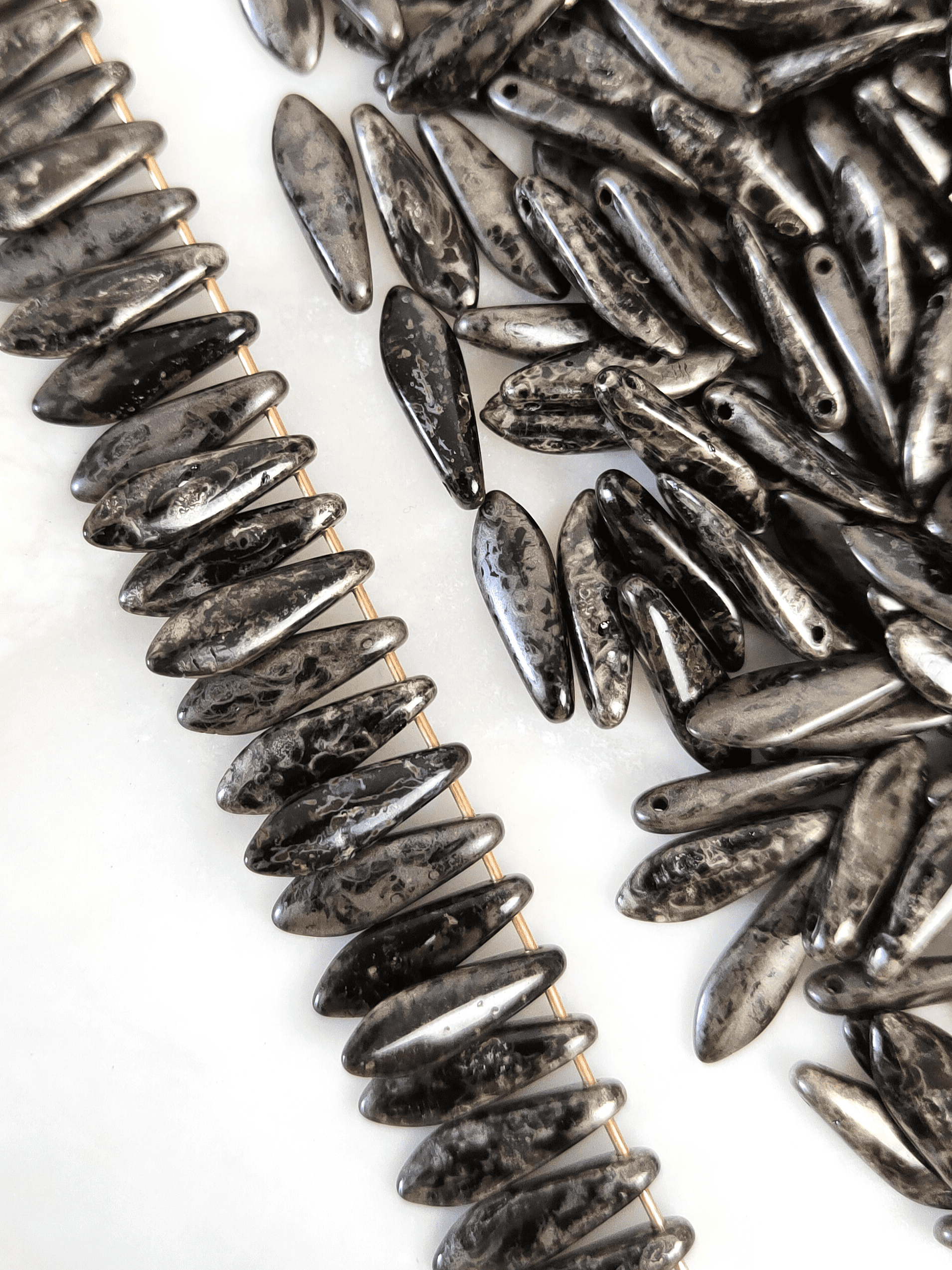 Bohemian dagger glass beads made of black glass with a shiny silver patterning, 5x16mm in size