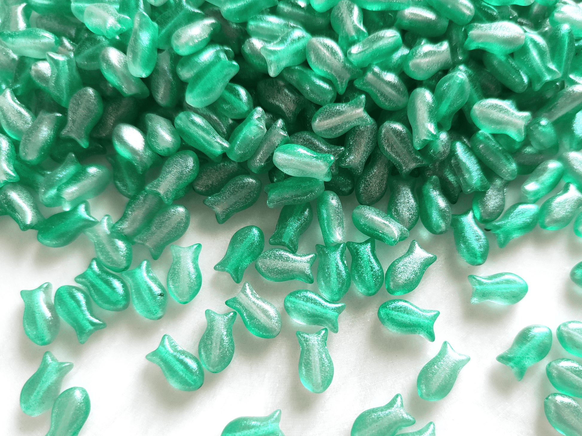 Bohemian fish glass beads in a simplistic style - these beads are made of colorless glass, dyed mixed green and silver and have a fine glitter finish, 10x6mm in size