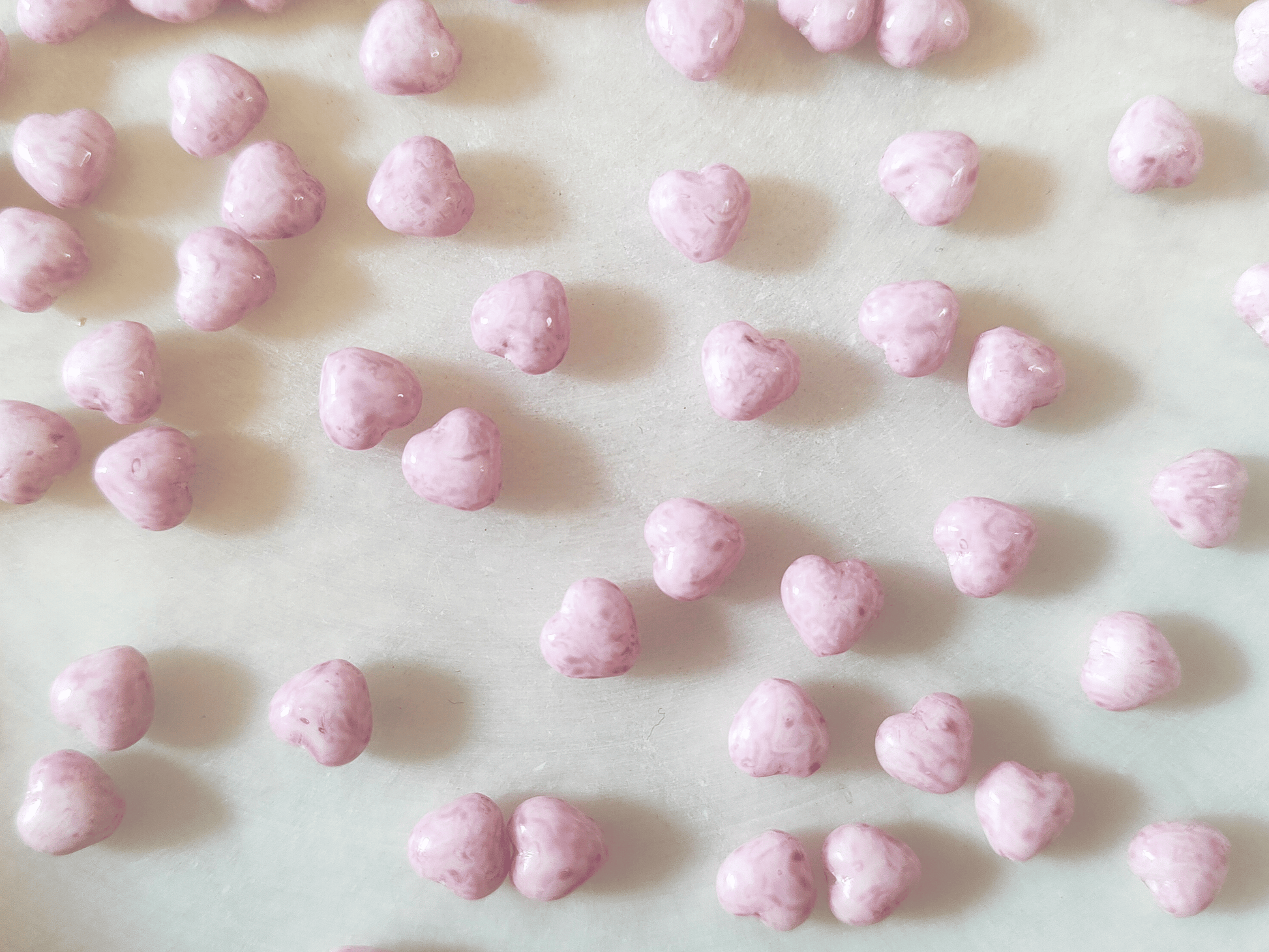 Cute Bohemian love heart glass beads made of opaque white glass and sprayed dusty light pink, 6mm in size