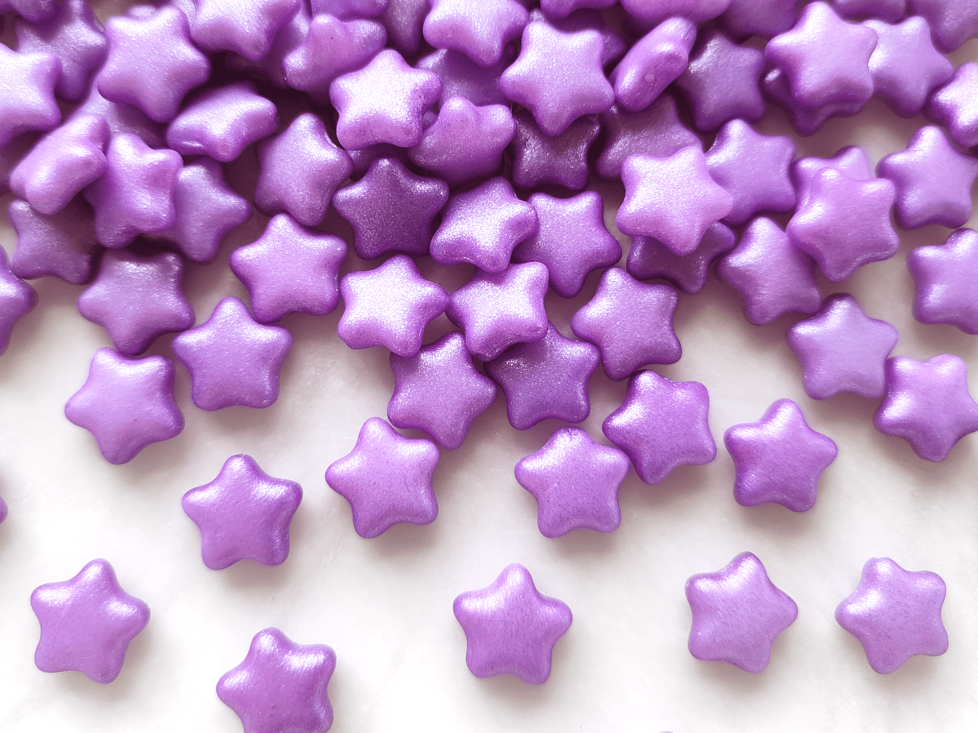 Large Bohemian star glass beads made of opaque white glass sprayed with vibrant purple and glitter dust, 12mm in size
