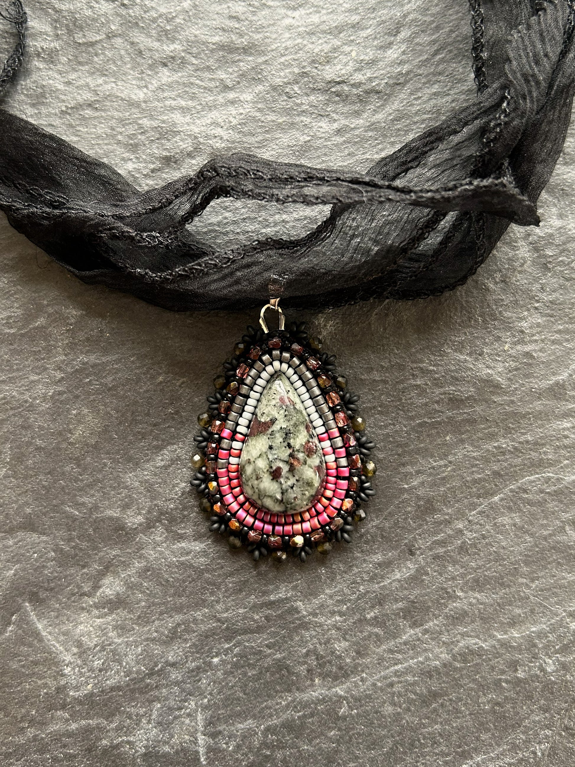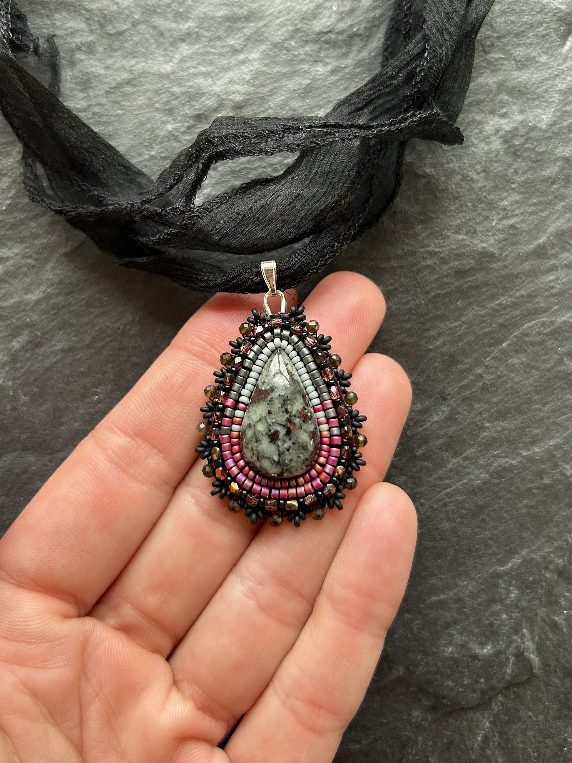 Ketten-Anhänger mit Eudialyt-Cabochon verziert mit funkelnden Glasschliffperlen, facettierten goldenen Onyx-Perlen und feinen Saatperlen