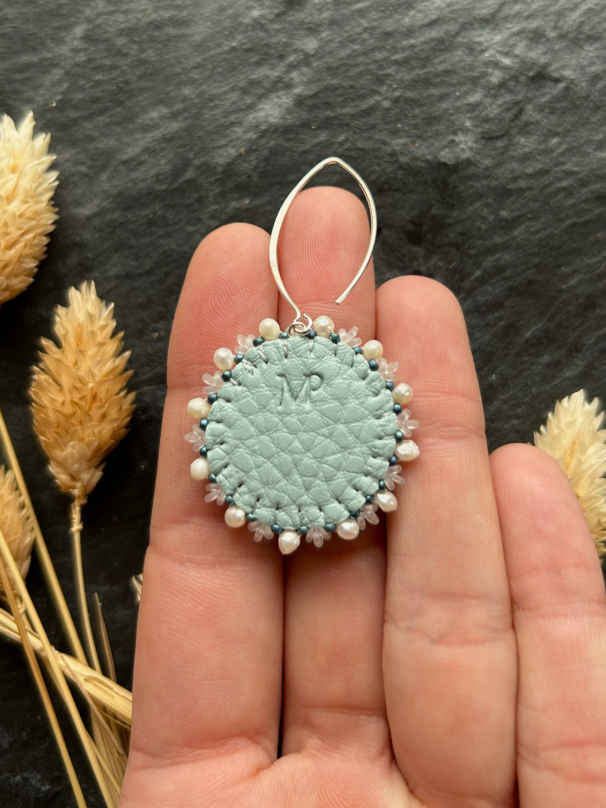 Ohrringe mit naturbelassenen Abalone-Perlmutt-Cabochons in kreisrunder Form umrahmt von schillernden Süßwasser-Perlen und feinen Saatperlen in weißen, türkis-farbenen und blauen Tönen