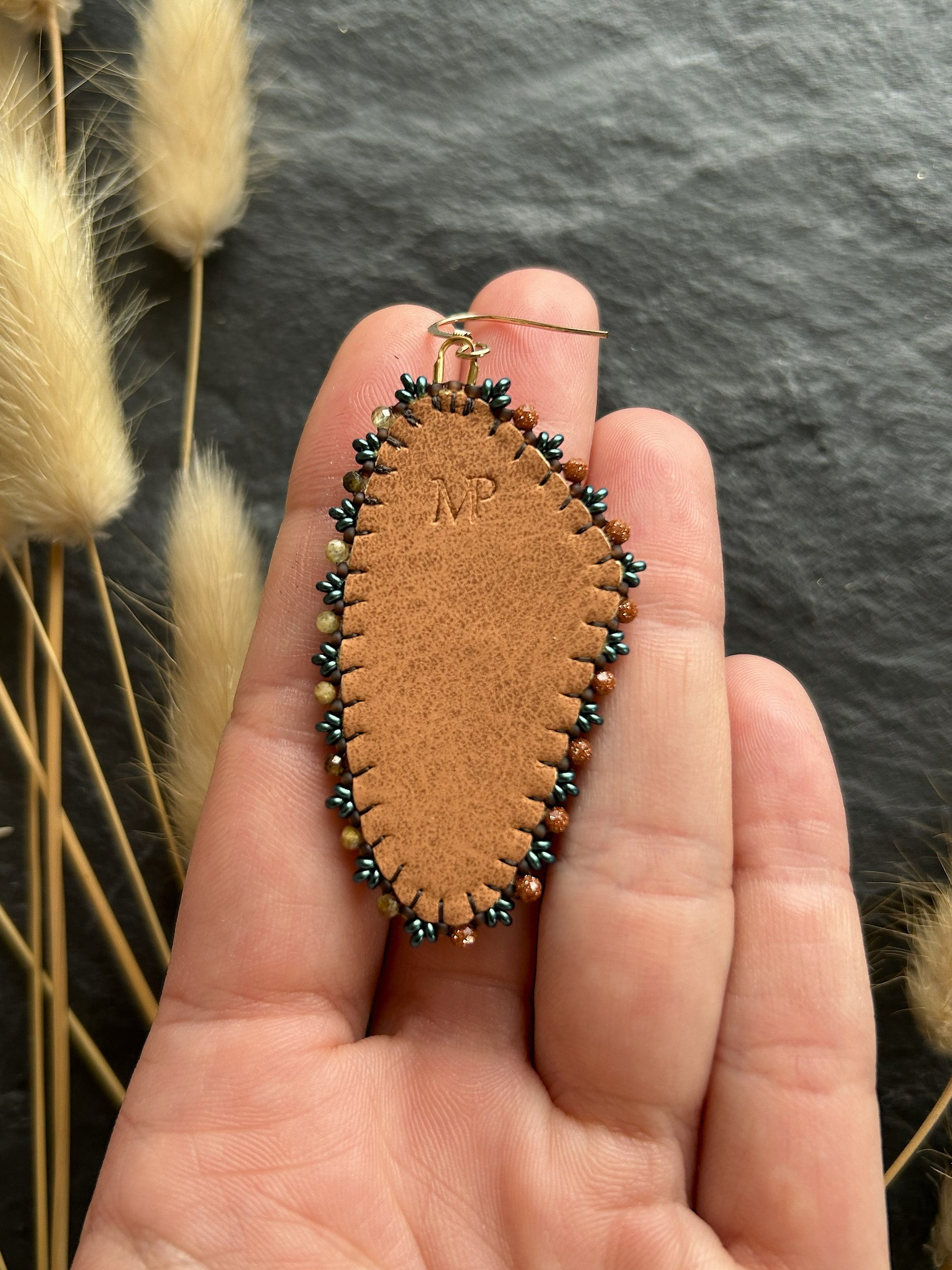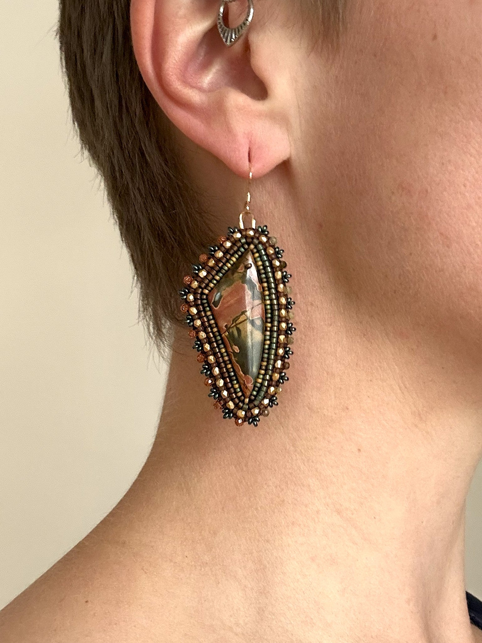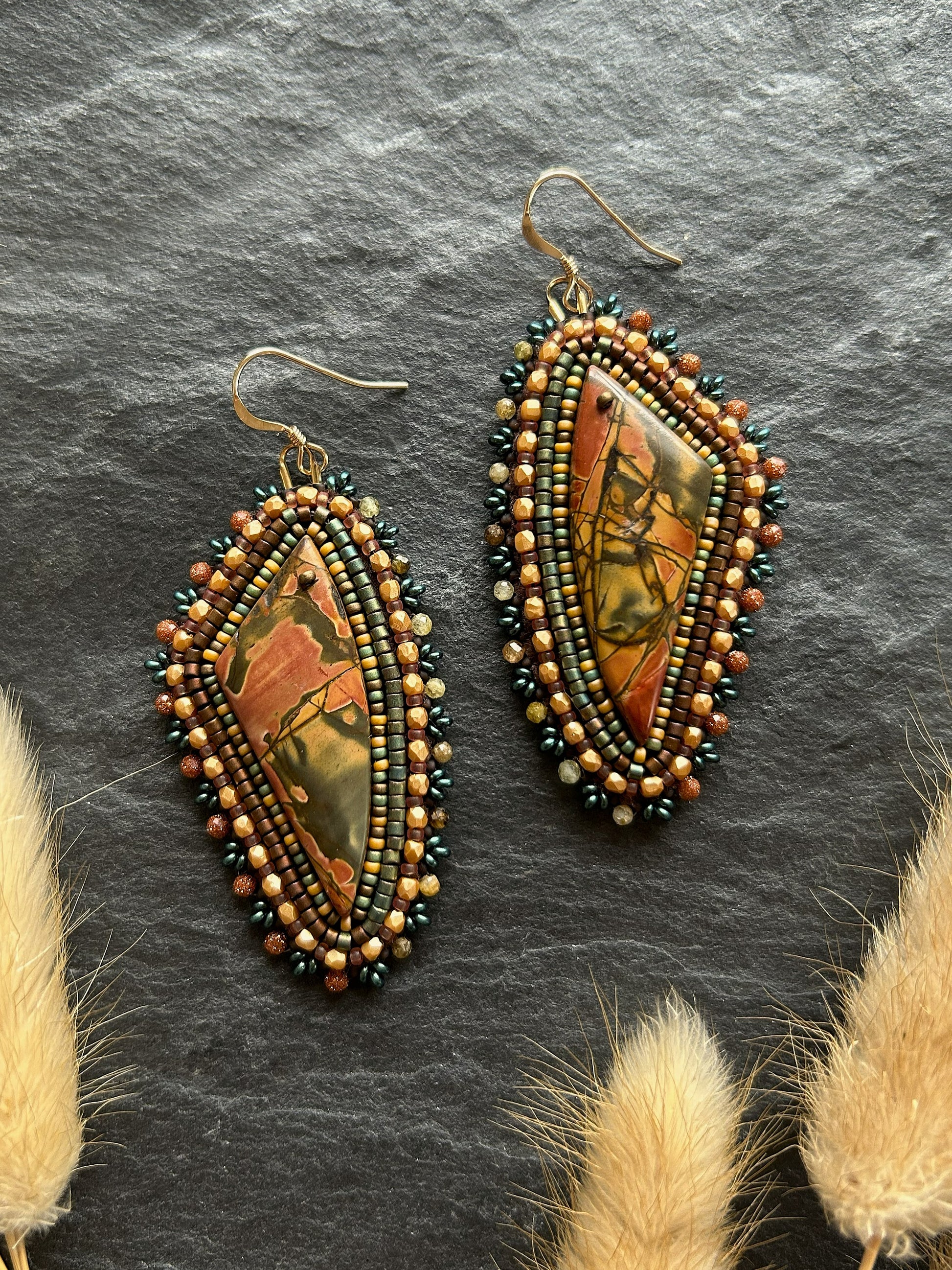Elegante Ohrringe mit polierten Jaspis-Cabochons umrahmt von Goldfluss- und grünen Granat-Perlen, feinen Saatperlen und Glasperlen in Gold, Rostbraun und Moosgrün