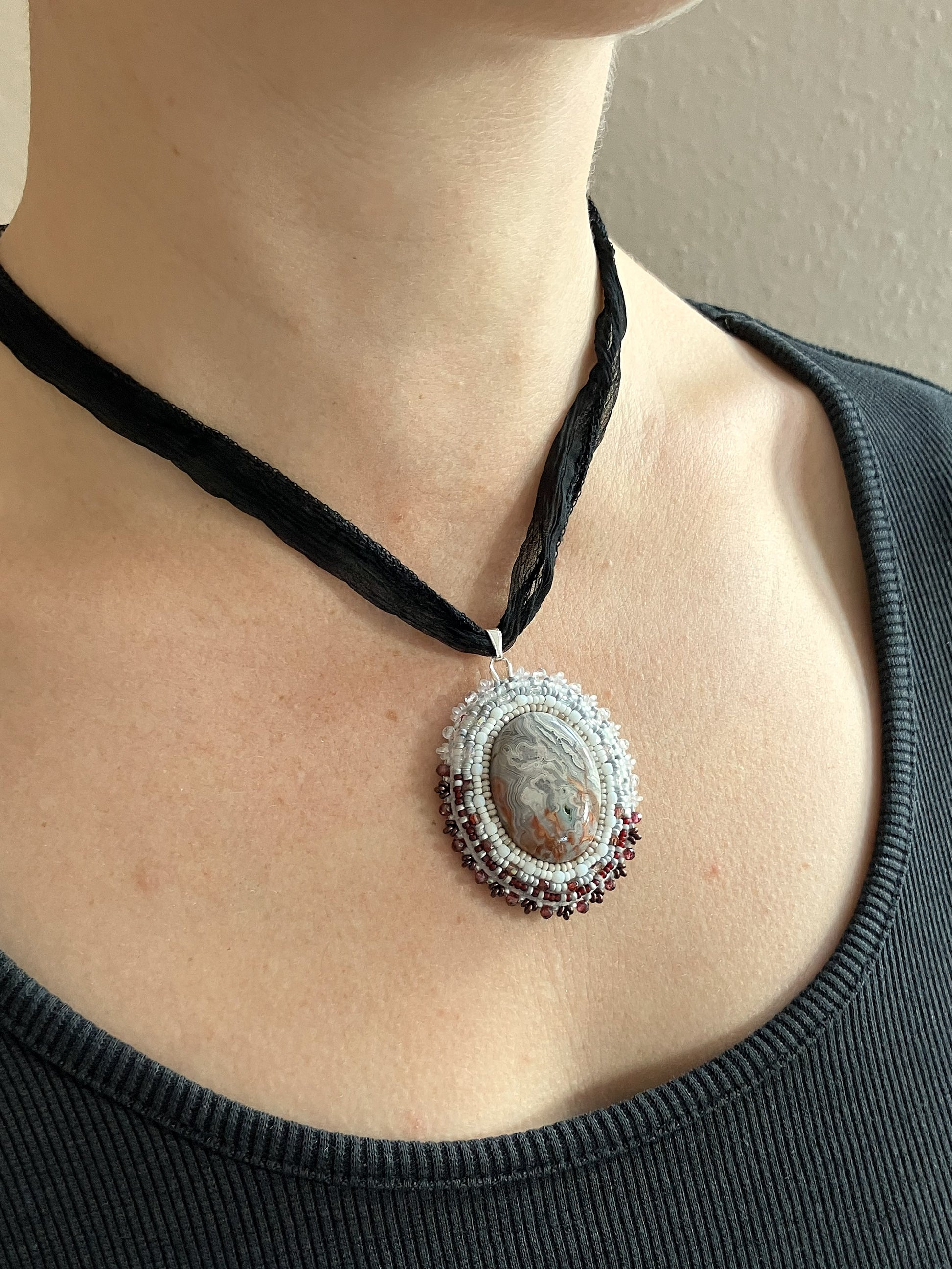 Necklace pendant with a finely banded agate cabochon in grey and red tones decorated with faceted red garnet and quartz beads, embroidered with fine charlottes and fire-polished beads
