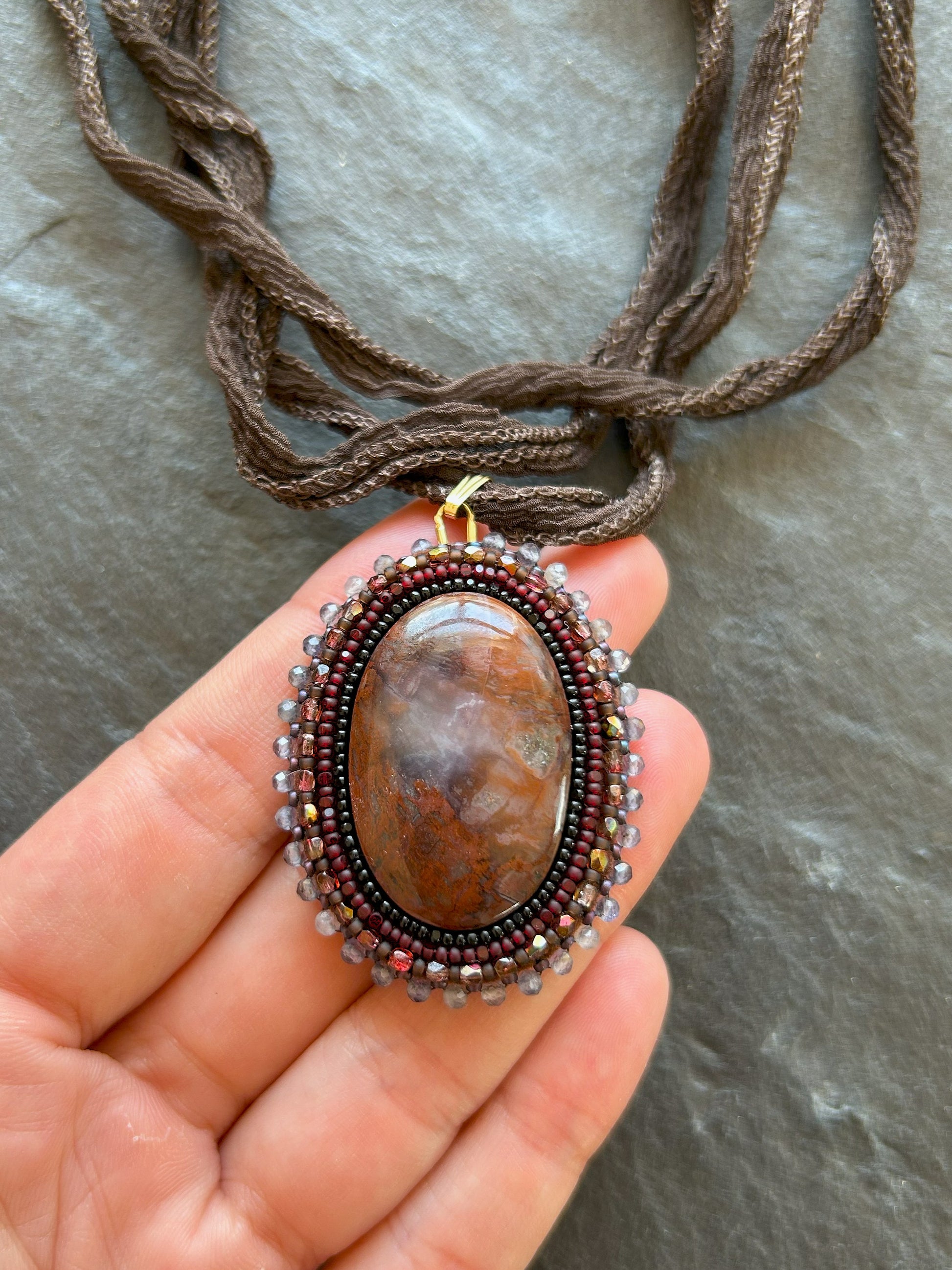 Brecciated jasper necklace pendant with iolite beads