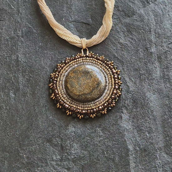 Necklace pendant with a bronzite cabochon decorated with faceted golden obsidian