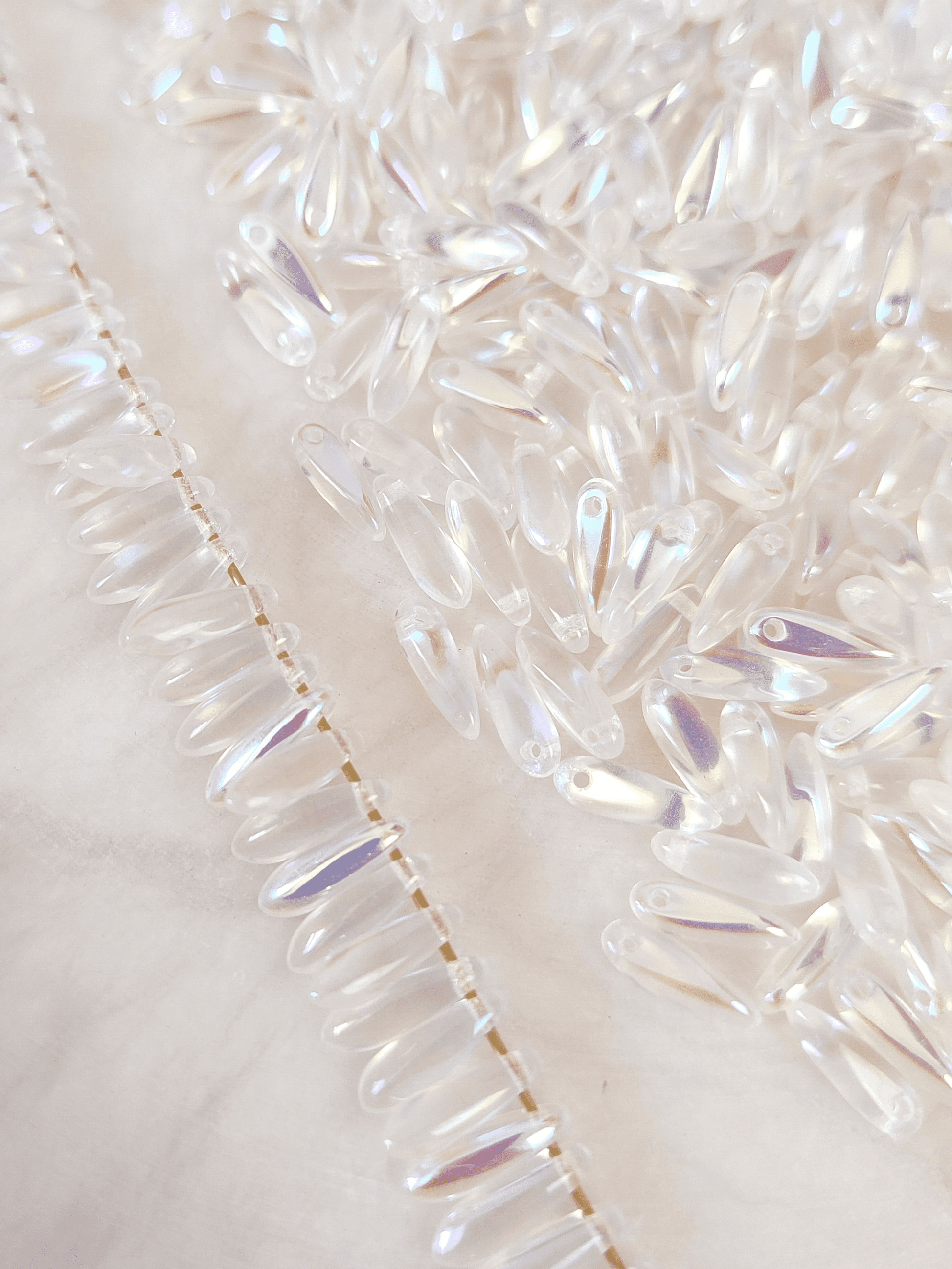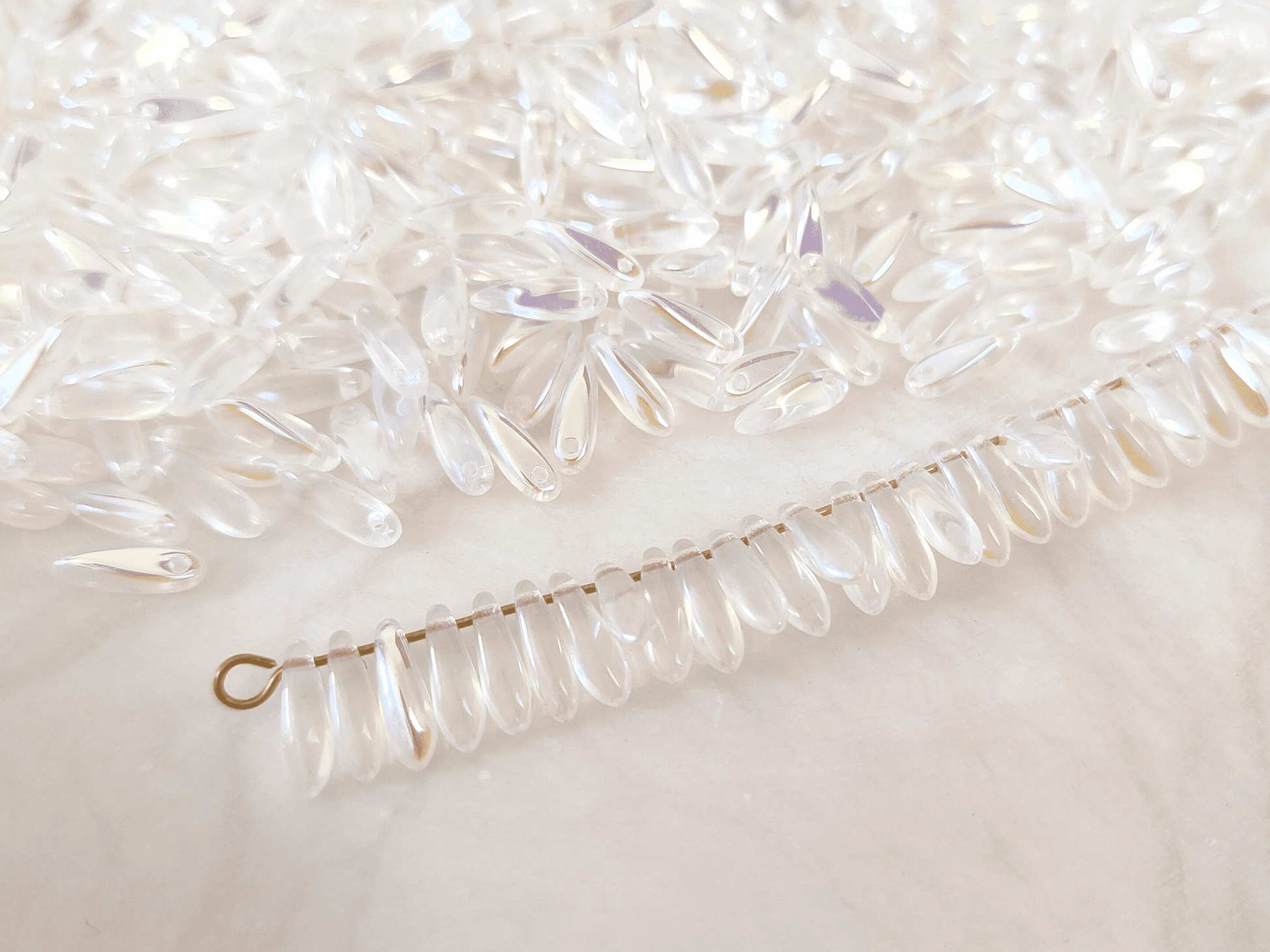 Small Bohemian dagger glass beads made of colorless glass with an iridescent finish, 3x11mm in size