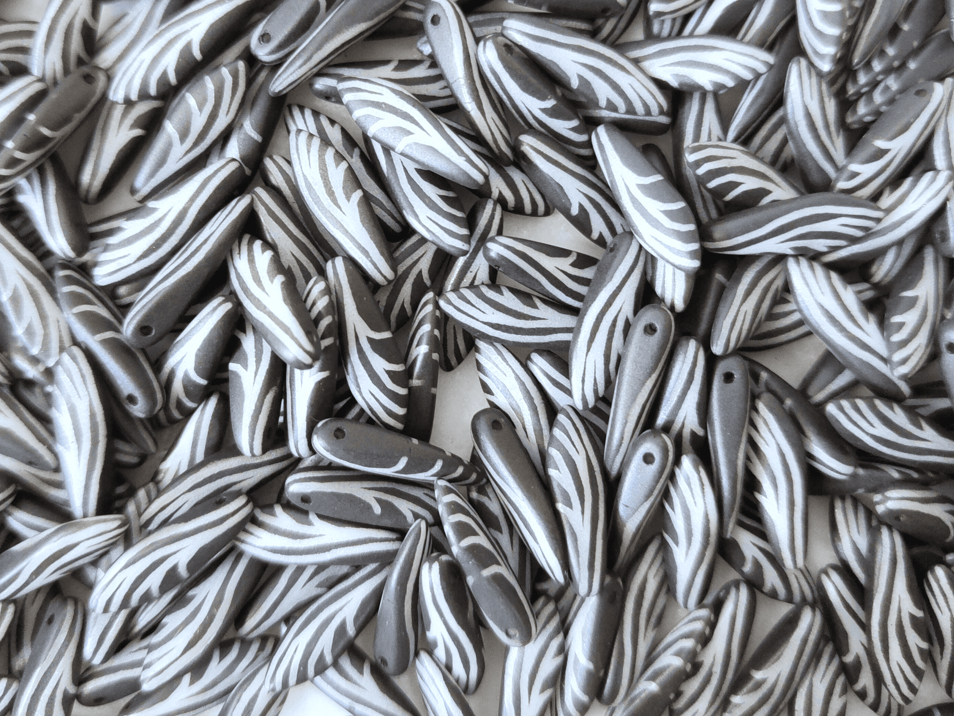 Bohemian dagger glass beads made of white glass with a delicate insect wing motif and a matt black coating, 5x16mm in size