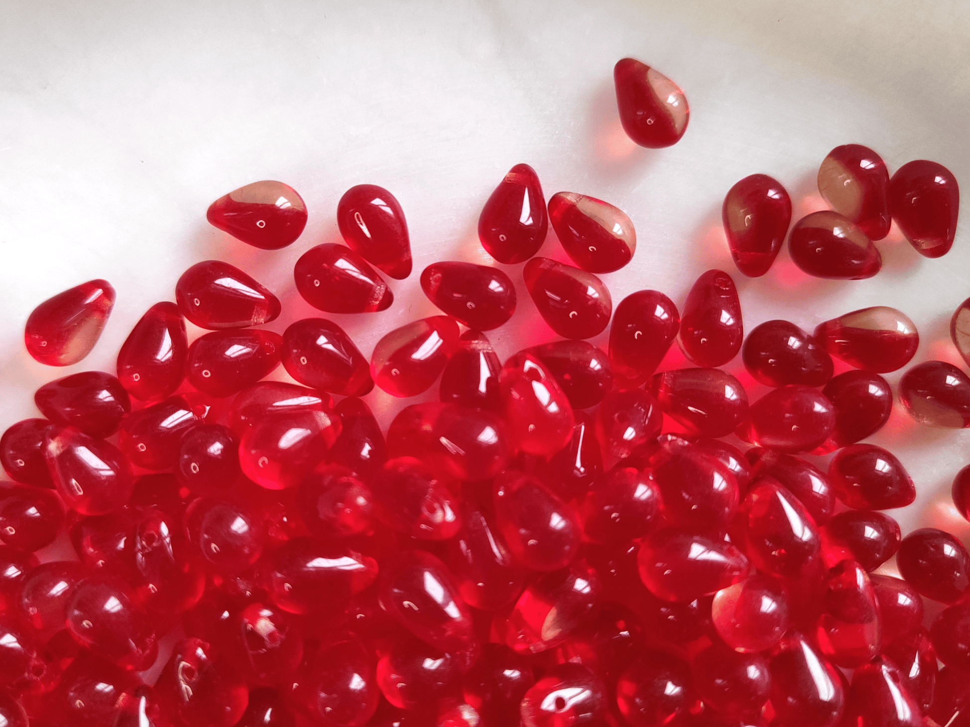 Bohemian drop glass beads made of bicolored colorless and red glass, 6x9mm in size