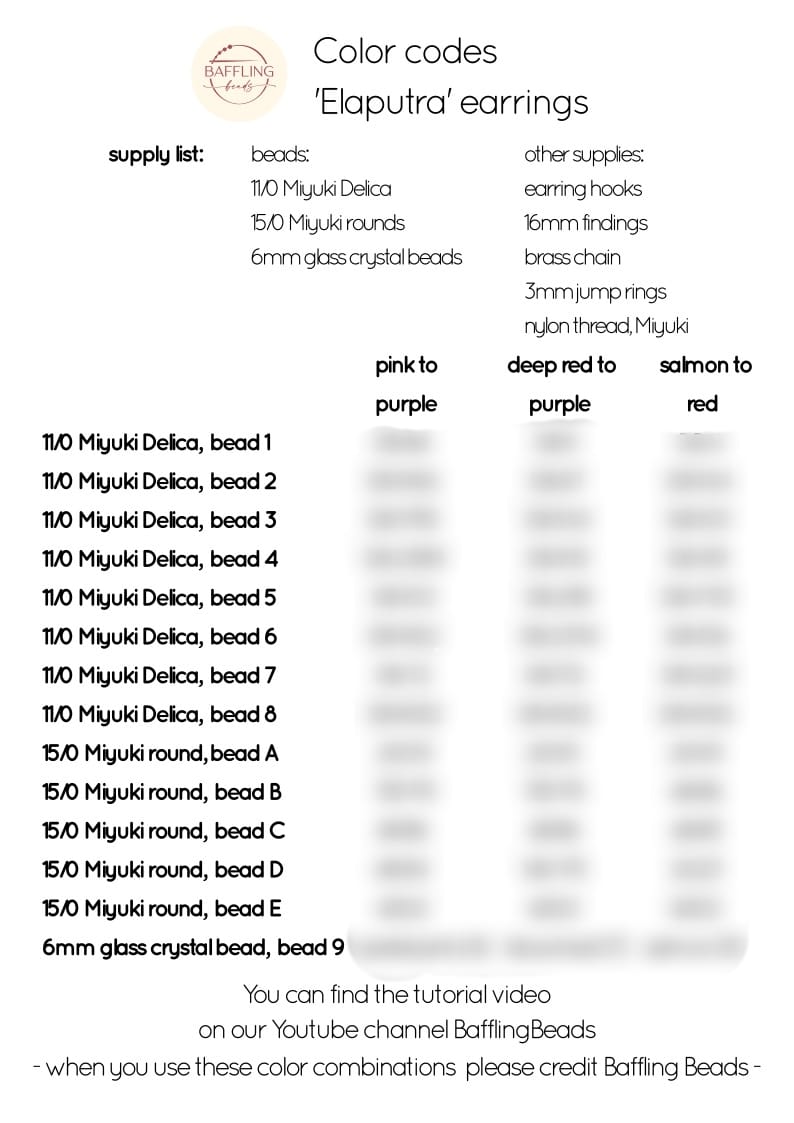 Bead graph and color codes for 6 of our ‘Elaputra’ dangle earring color variations