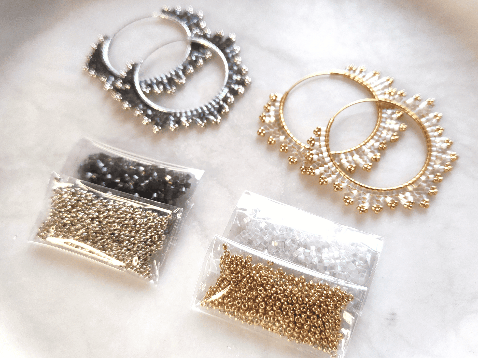 This bead kit contains Miyuki Delica 11/0 beads in two different satin colors, as well as Miyuki 15/0 seed beads in two different metallic colors. The color codes for the beads are also included. The kit contains a total of 8 grams of fine Miyuki brand beads—2 gram of Miyuki Delica beads in each color and 2 grams of Miyuki seed beads in each color. The quantity of beads is sufficient to weave at least two pairs of "Estelle" hoop earrings.