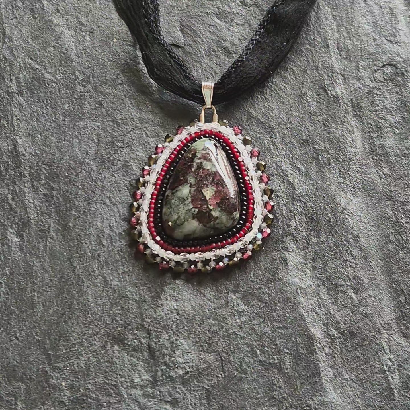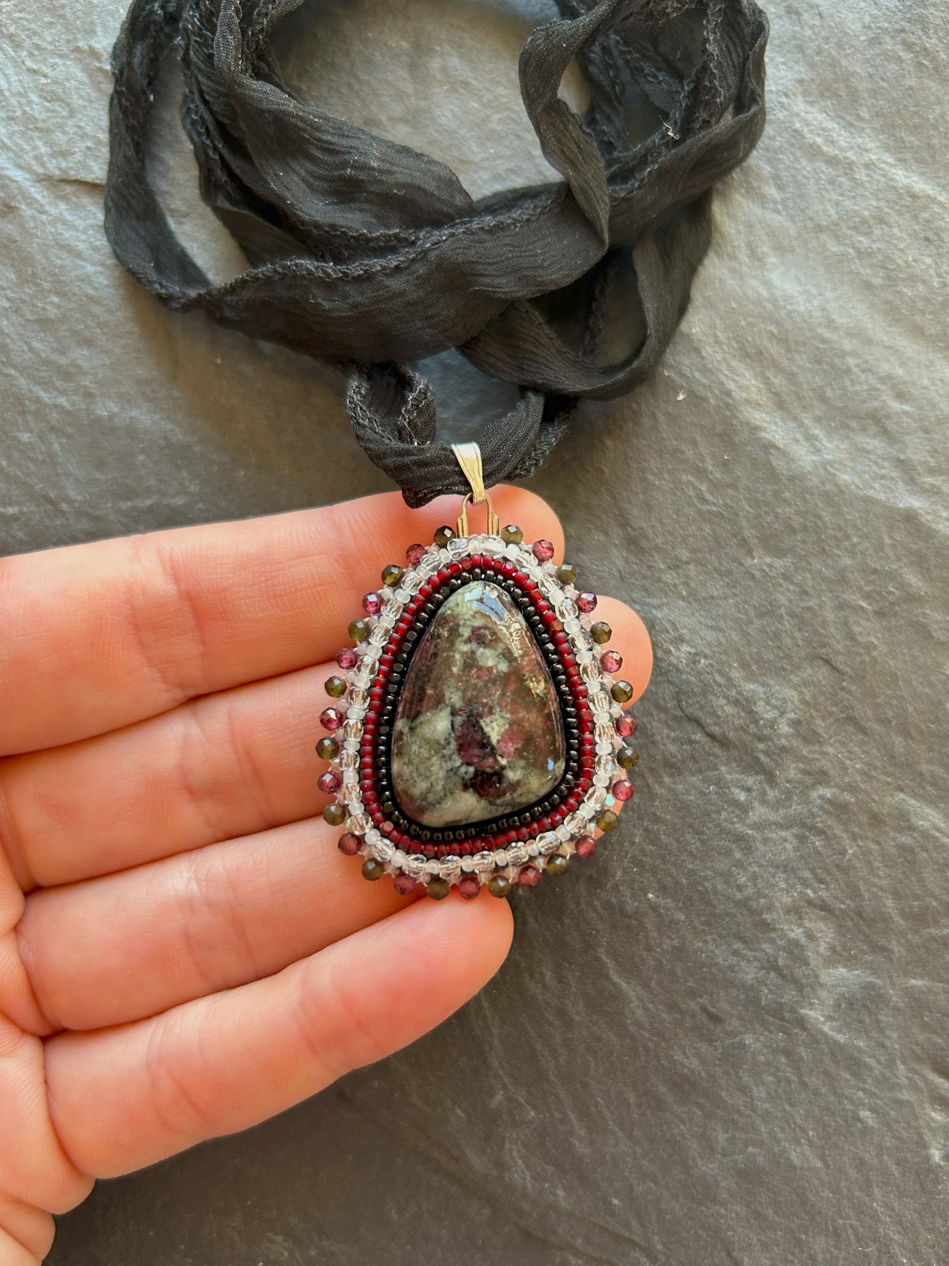 Necklace pendant with a eudialyte cabochon decorated with faceted red garnet and golden obsidian