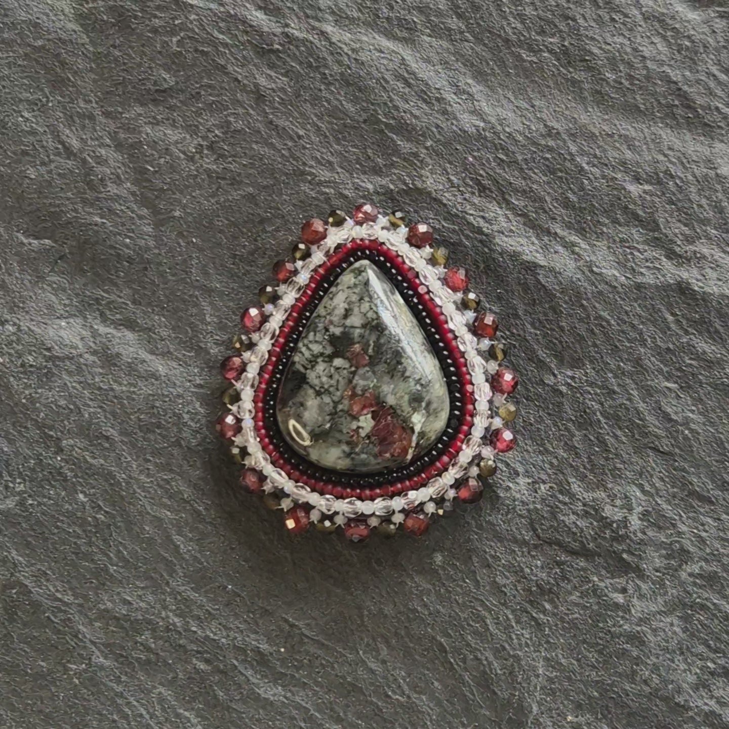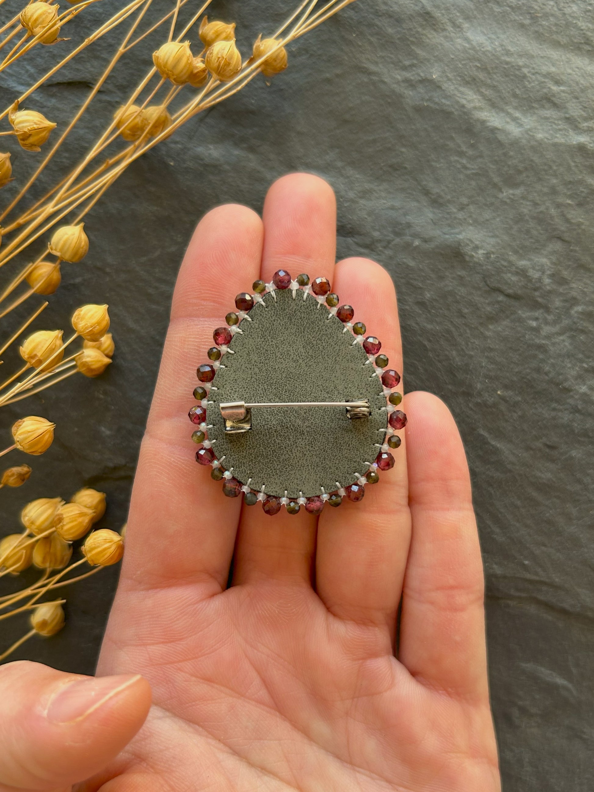 Unique brooch with an eudialyte cabochon surrounded by faceted red garnet and golden obsidian