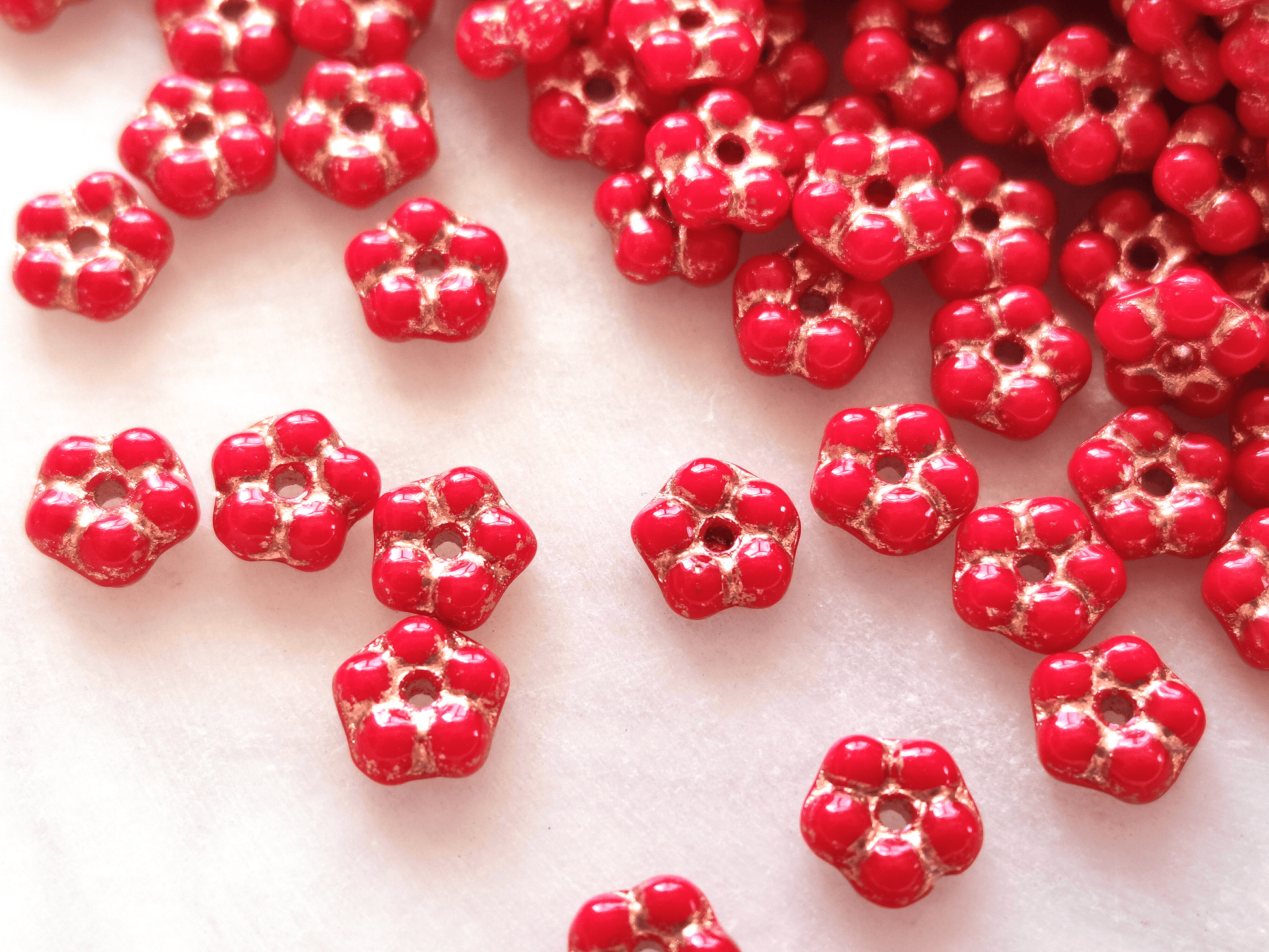 Tiny Bohemian flower glass beads in the shape of a forget-me-not flowers - these beads are made of red glass and have golden details, 5mm in size