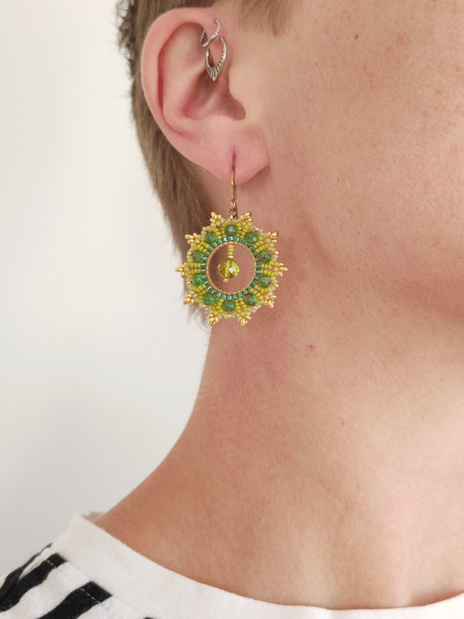 Free-style woven earrings in vibrant colors with a mandala look and sparkly beads