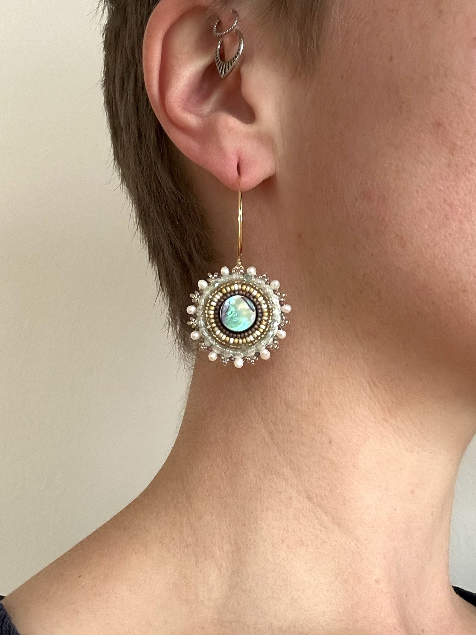 Earrings with natural abalone shell cabochons in circular shapes decorated with beautiful freshwater-cultured pearls and fine seed beads in white, cream and gold shades
