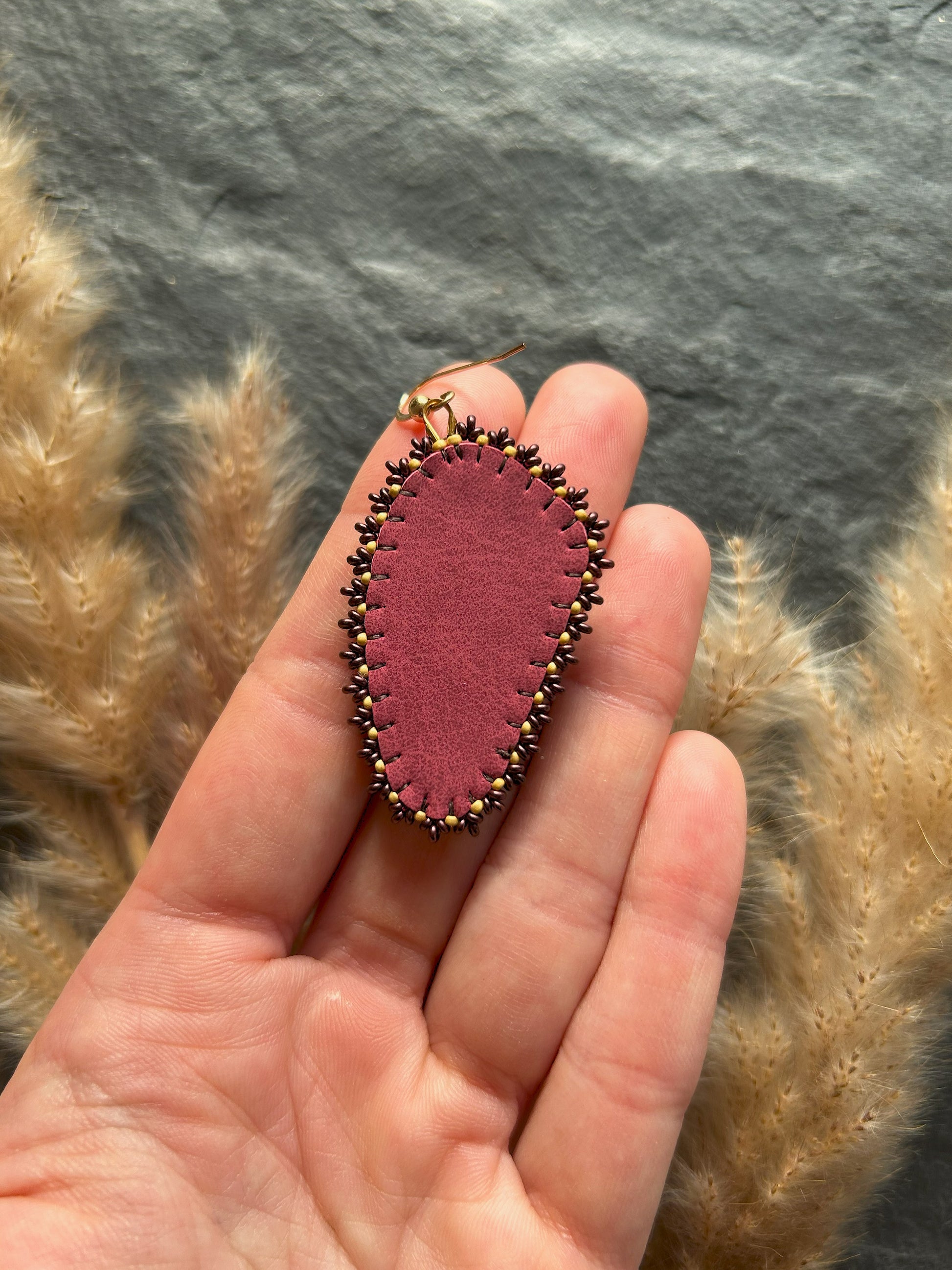 Elegant earrings with polished jasper cabochons decorated with fine seed beads in warm red and yellow combined with beads in muted bronze shades