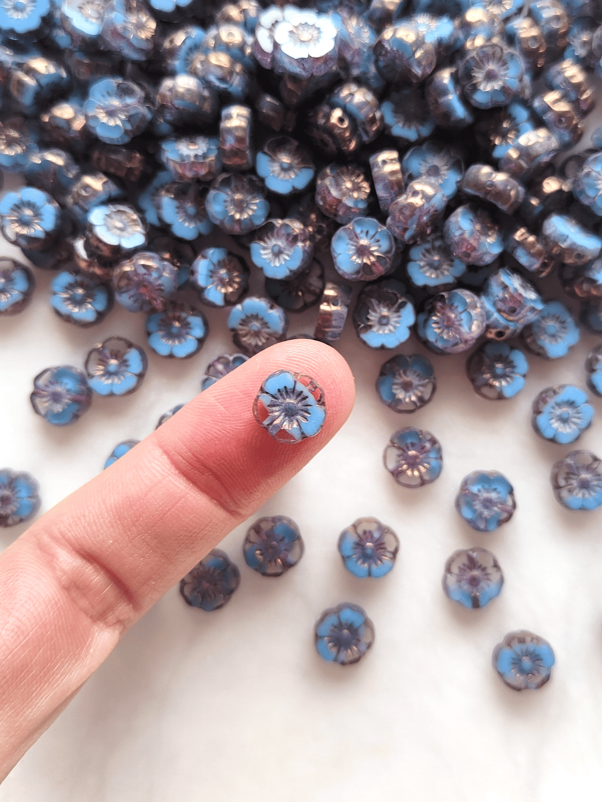 Small Bohemian table-cut glass beads in the Hawaii flower design made of bicolored colorless and light blue glass with a luster finish, 8mm in size