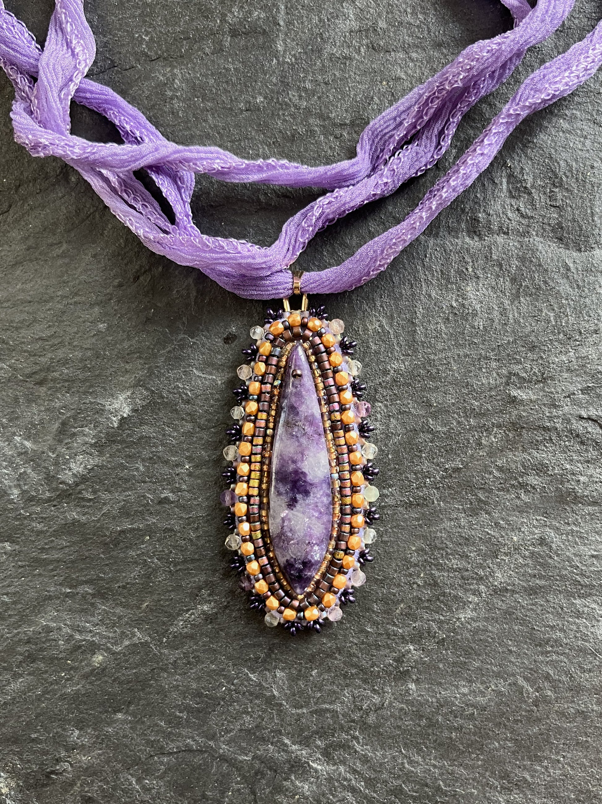 Necklace pendant with a lepidolite cabochon decorated with sparkly fire-polished glass beads and Charlotte beads as well as faceted fluorite beads