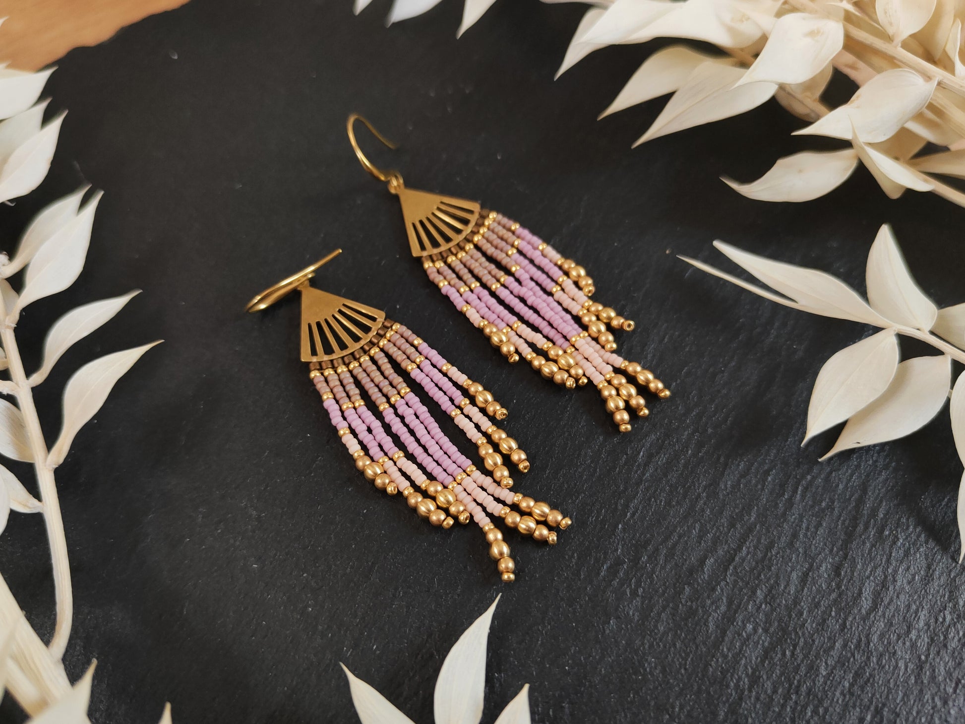 Fine fringe earrings with fan design findings and micro seed beads - woven with high-quality, very lightweight seed and delica beads and small golden Czech beads