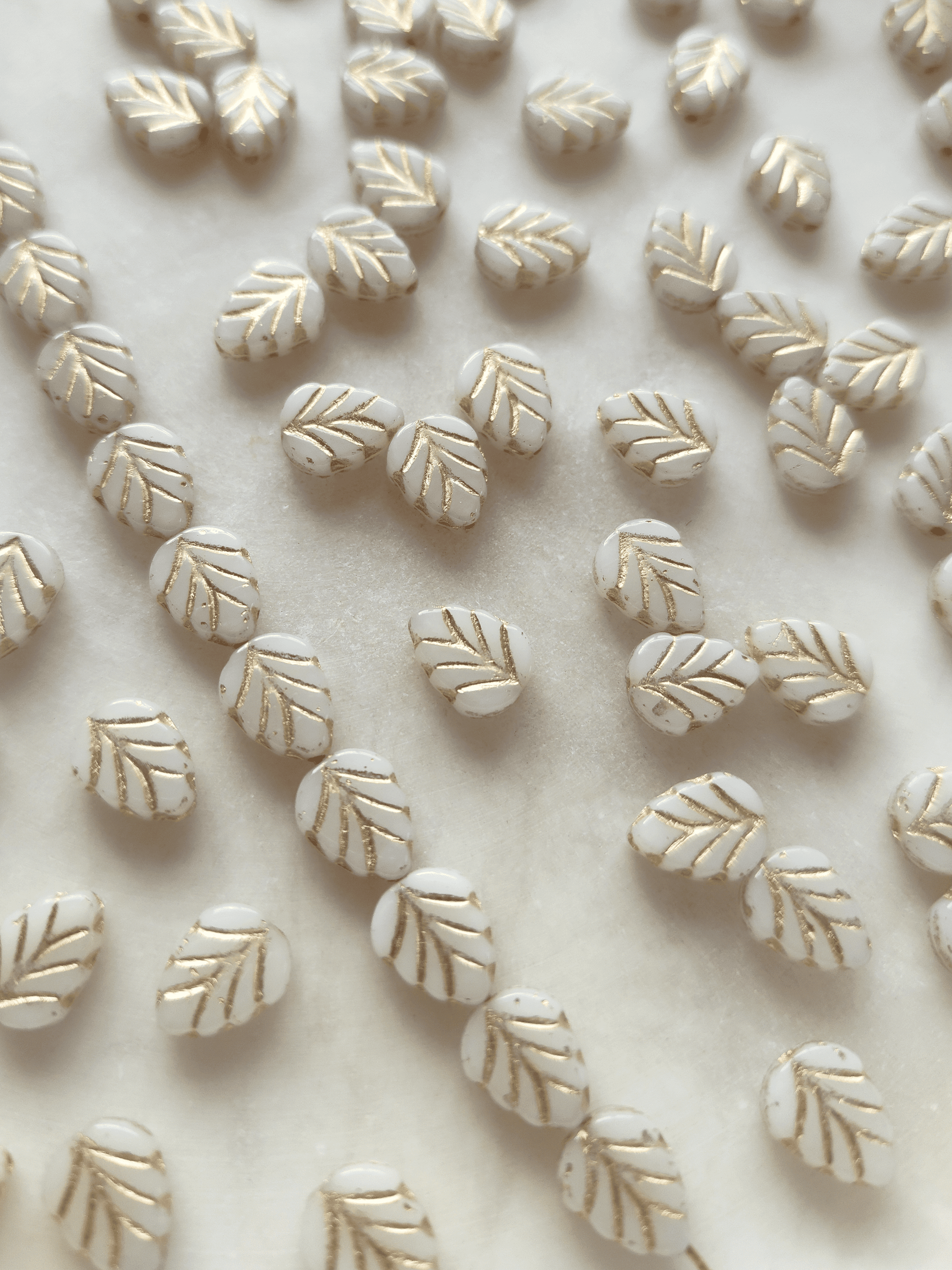 Small Bohemian leaf glass beads in the shape of simple mint leaves with fine pressed details - these beads are made of white glass with golden details, 10mm in size