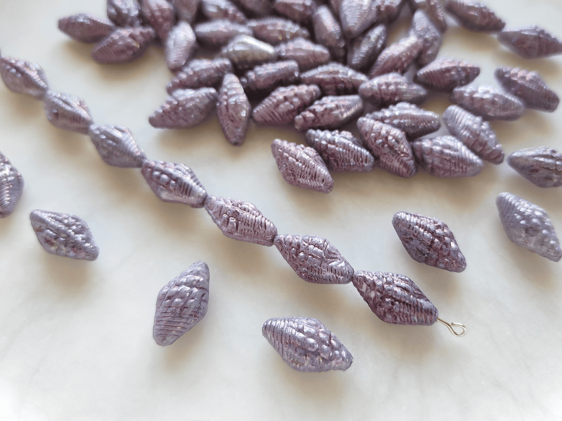 Bohemian shell glass beads in the shape of a miter shell with fine pressed details - these beads are made of opaque white glass, dyed purple with shiny dark purple details, 16x8mm in size
