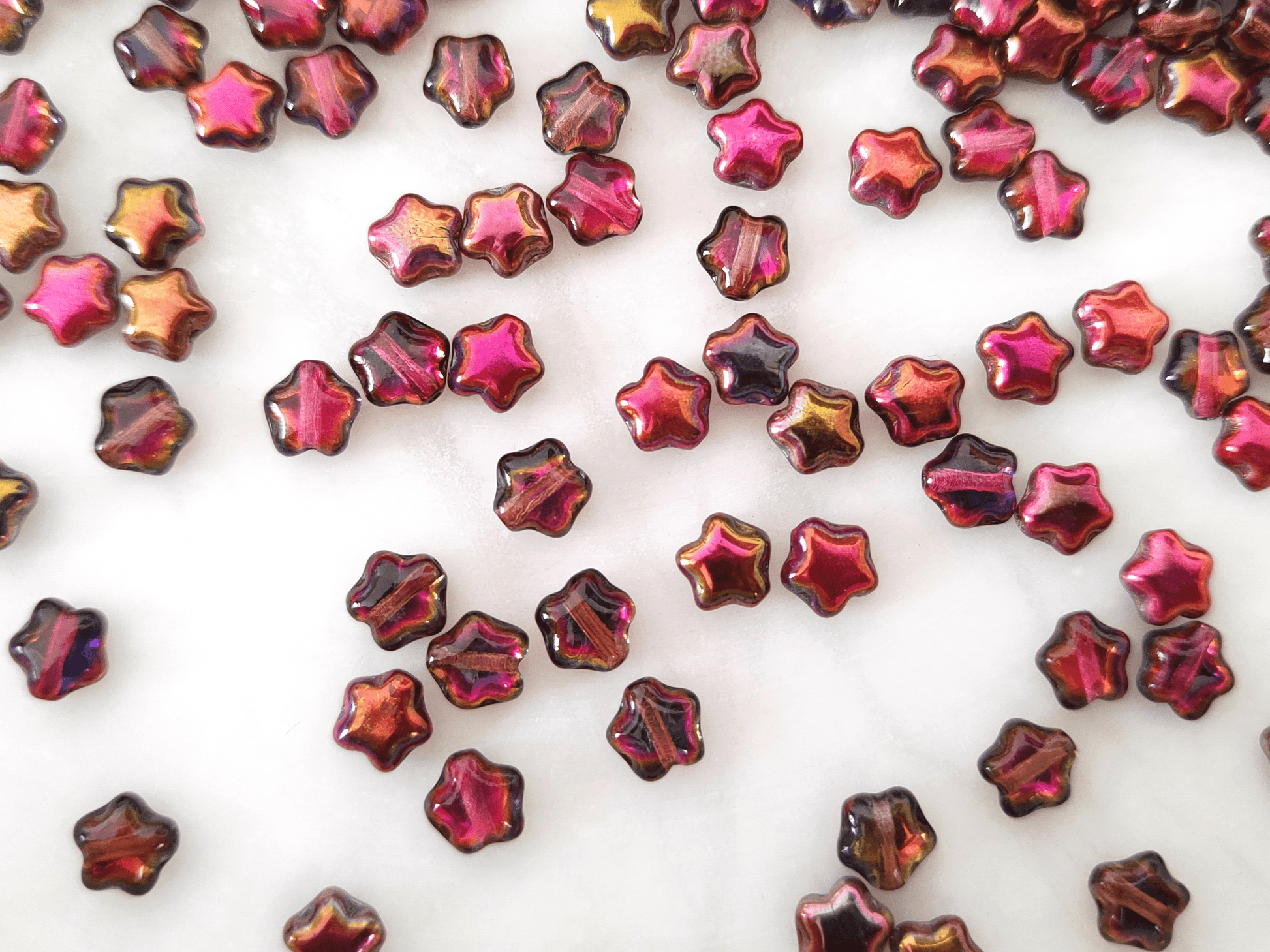 Cute Bohemian star glass beads made of colorless glass with a half red and pink marea finish, 6mm in size