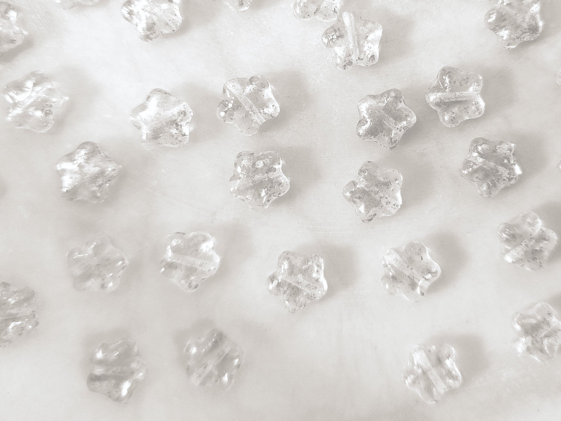 Small Bohemian star glass beads made of colorless glass with silver speckles, 8mm in size