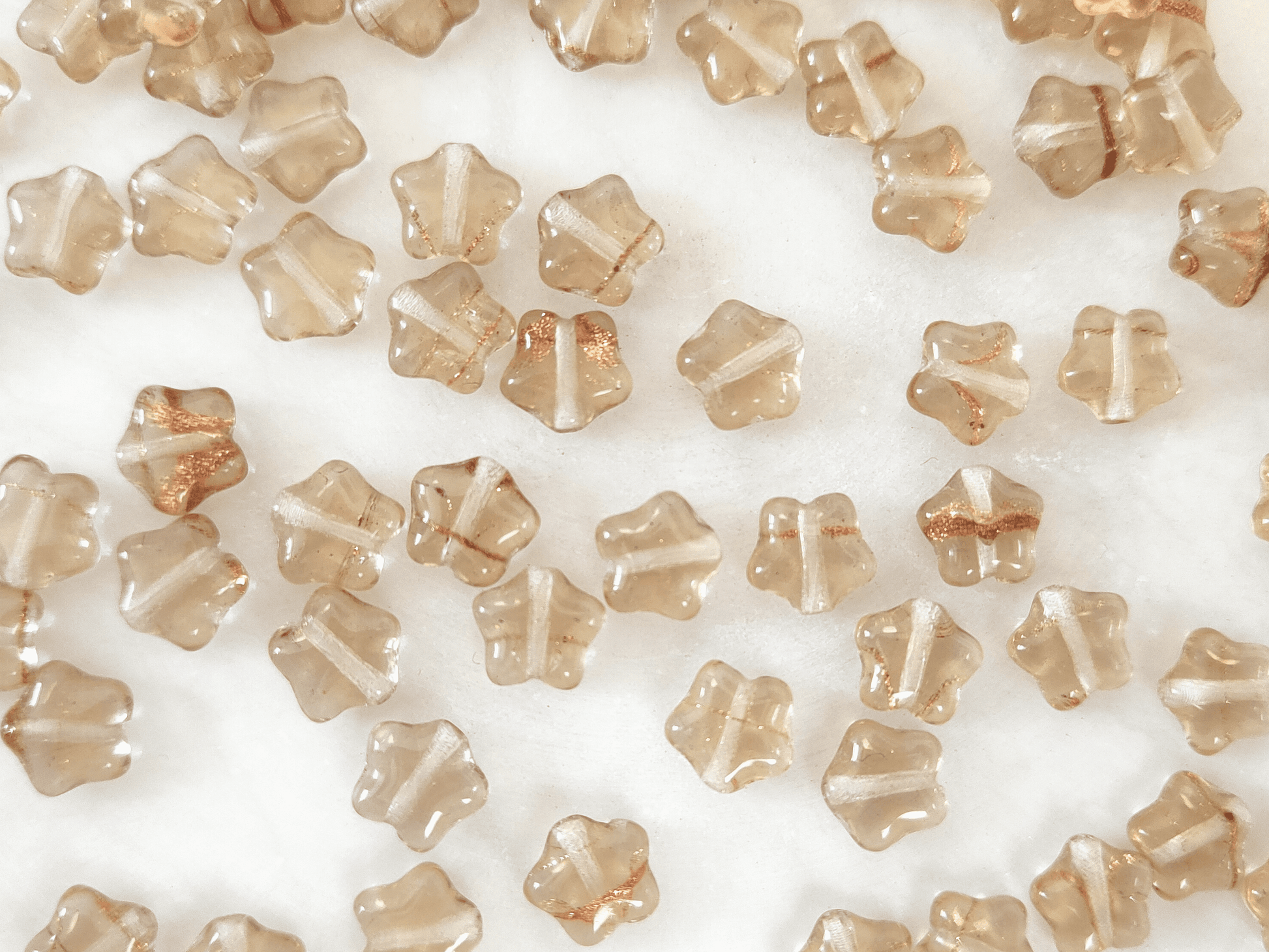 Small Bohemian star glass beads made of transparent light brown glass and copper dust inside, 8mm in size