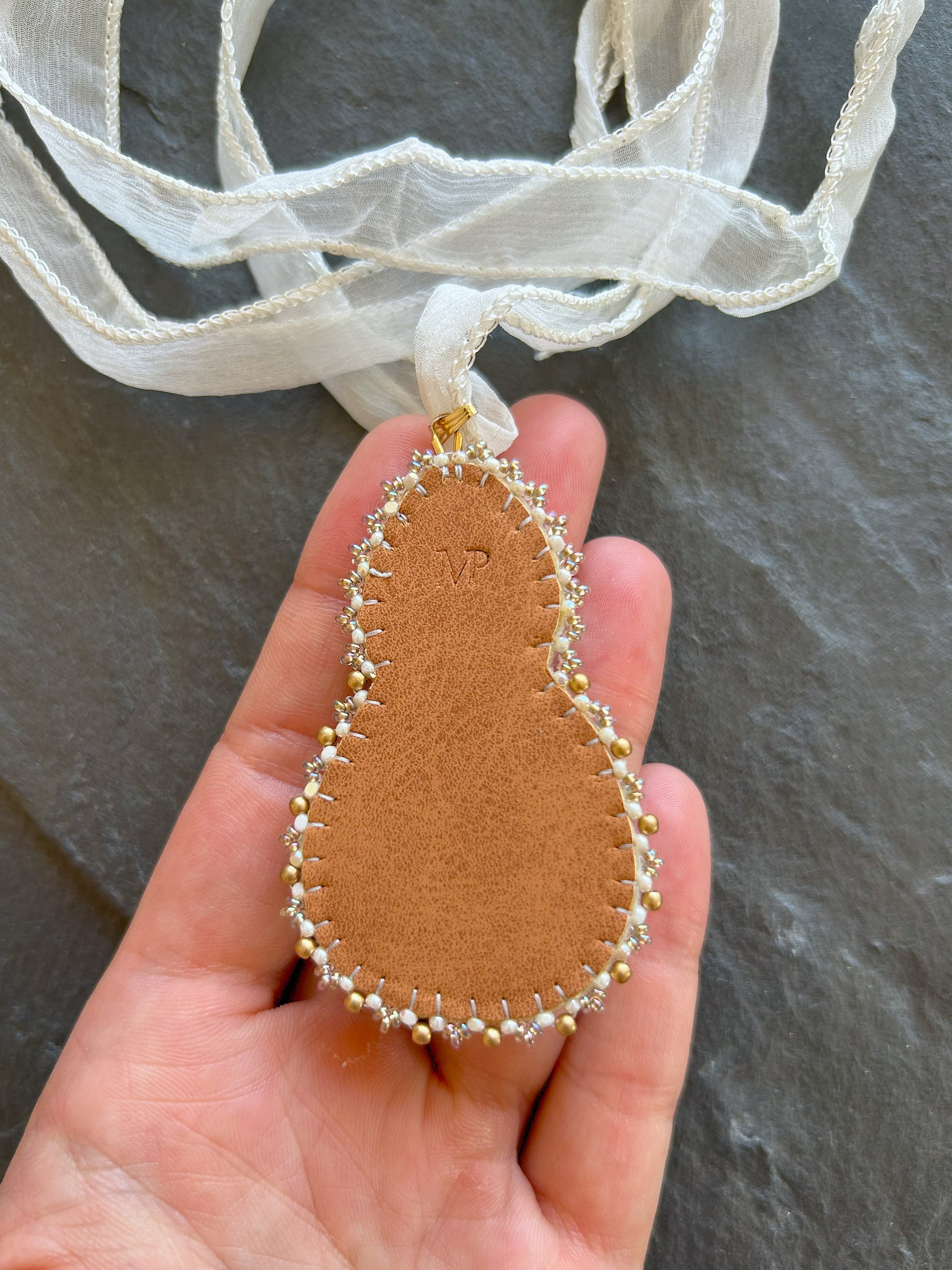 Necklace pendant with moonstone (belomorite) cabochons decorated with premium glass beads