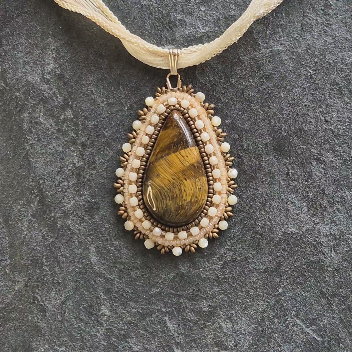 Necklace pendant with a tiger's eye cabochon decorated with faceted shimmering shell beads
