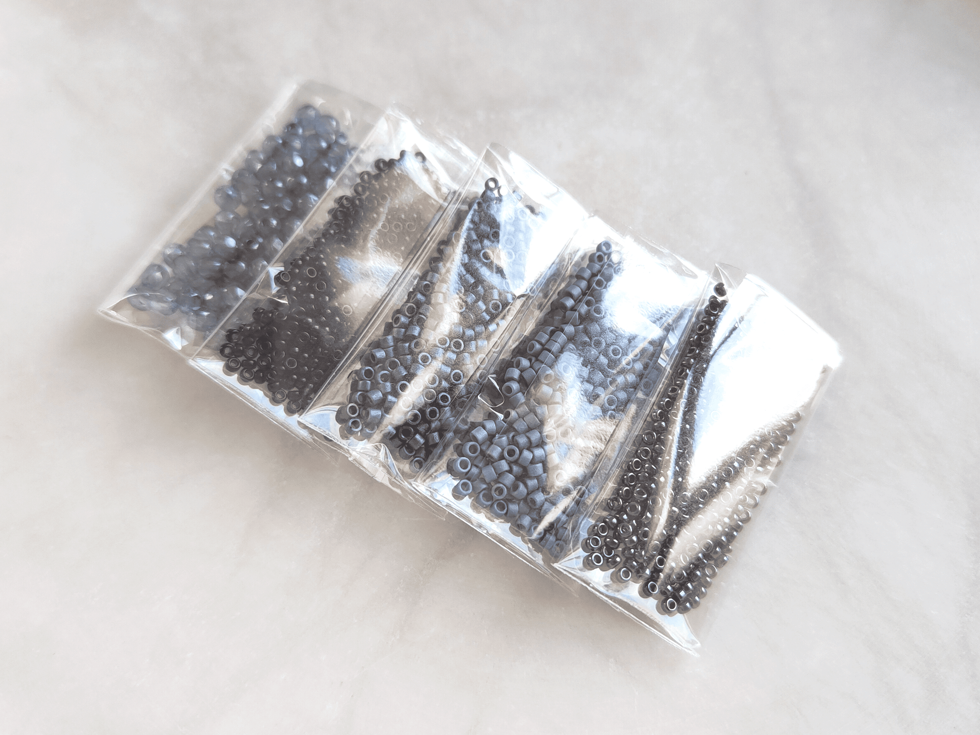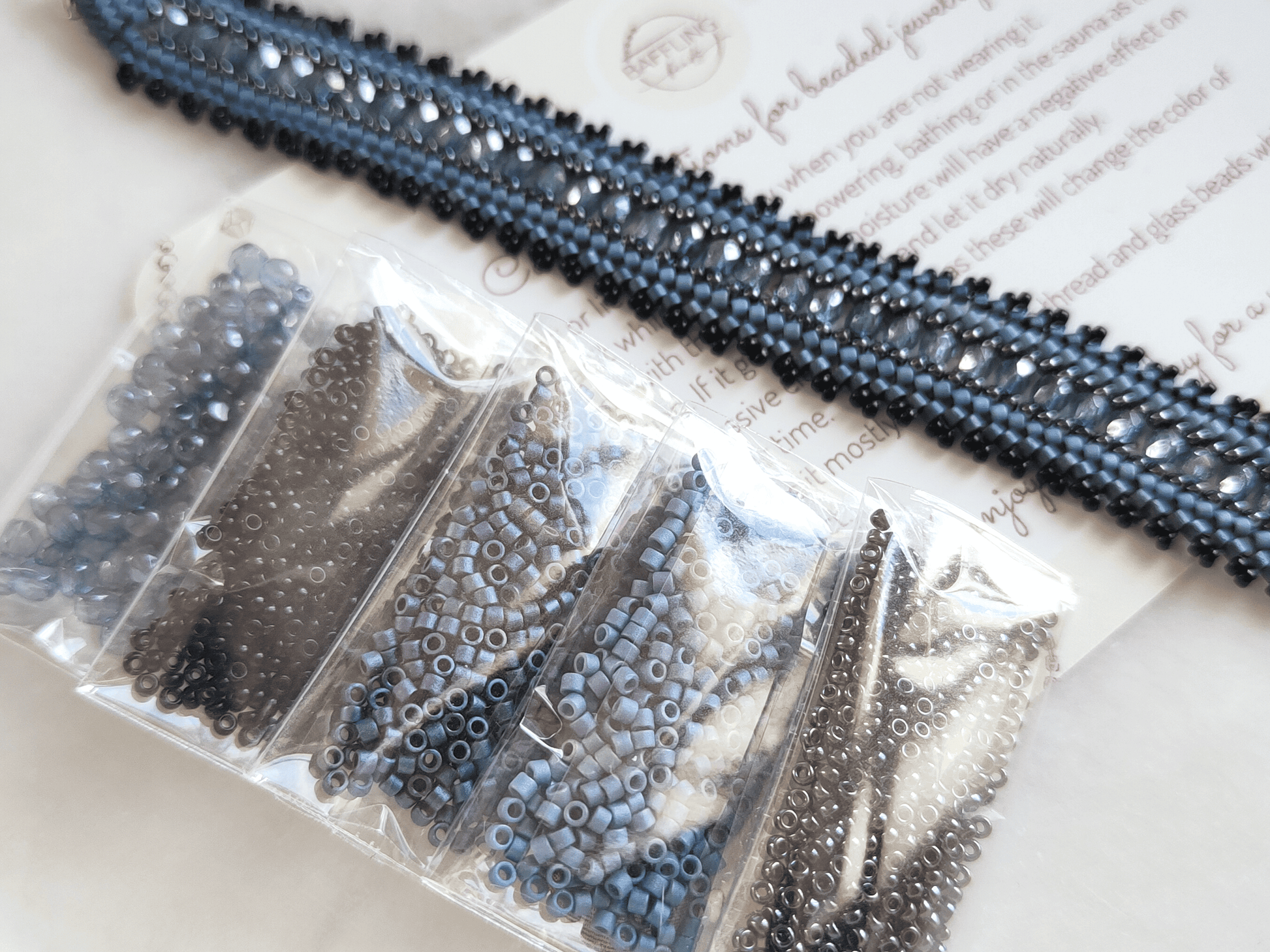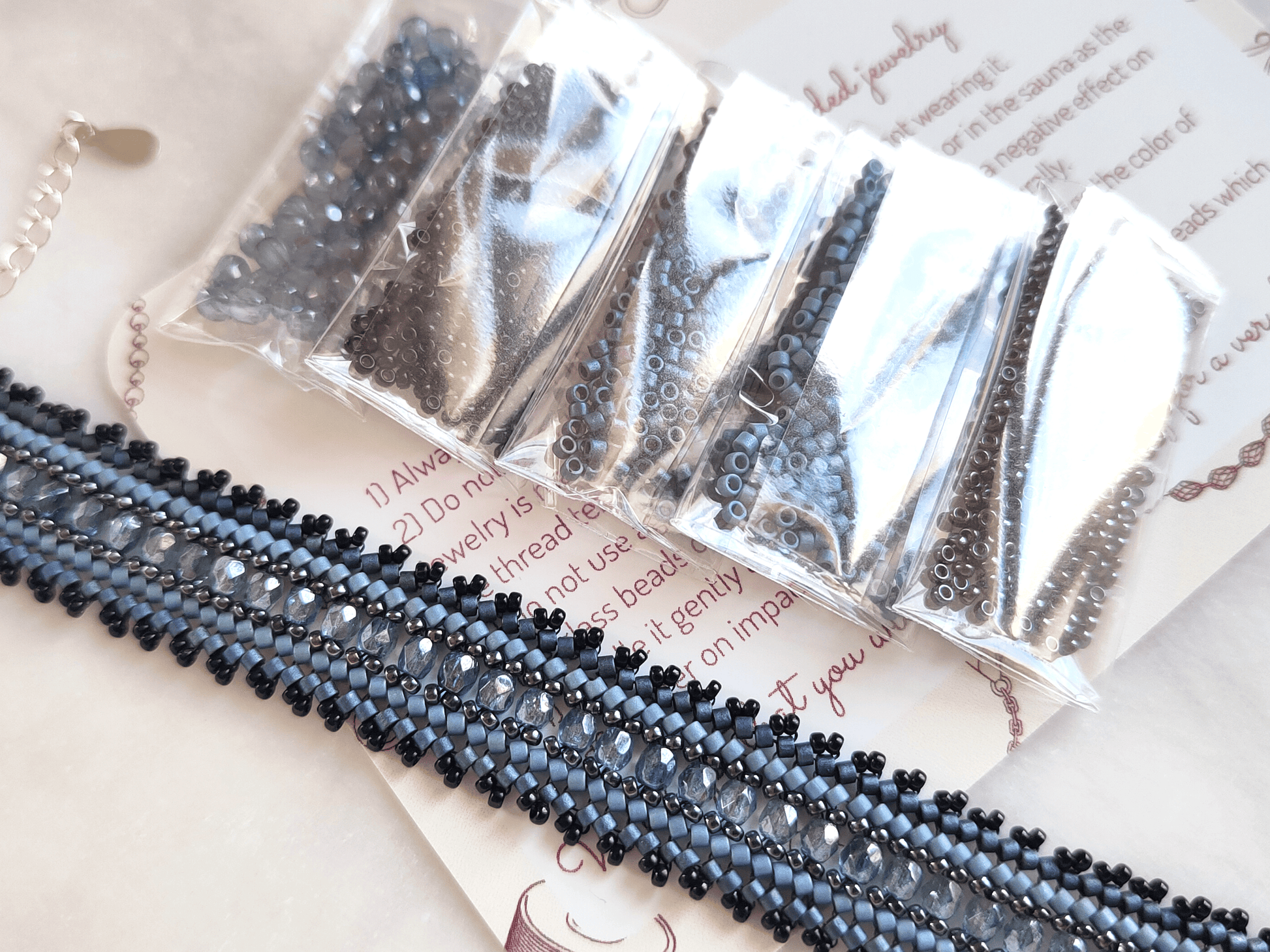 Dieses Perlen-Kit enthält Miyuki Delica Perlen 11/0, Miyuki Samenperlen 15/0 sowie 3mm Glasschliffperlen - die Farbcodes der Perlen werden mitgeliefert. Das Kit umfasst insgesam 11 Gramm Perlen - böhmische Glasperlen und feine Marken-Perlen von Miyuki - jeweils 2 Gramm Miyuki Delica Perlen je Farbe, 2 Gramm Miyuki Samenperlen je Farbe und 3 Gramm Glasschliffperlen. Die Menge der Perlen ist ausreichend, um ein Set mit einem Armband und ein Paar Creolen zu weben.
